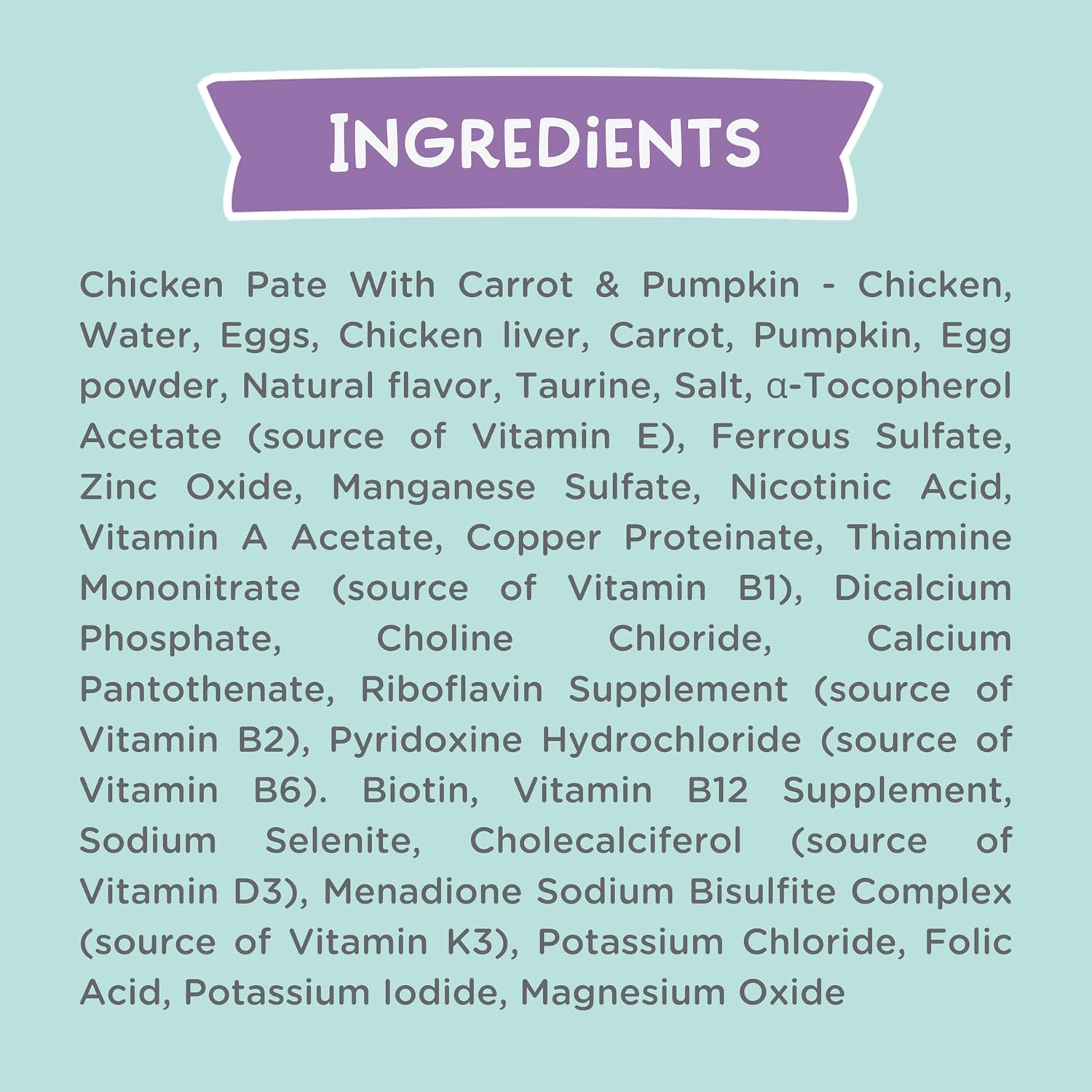 - GRAIN FREE & NON-GMO: Our pate chicken, carrot, & pumpkin is prepared without any grains, artificial additives, or by-products, as our goal is to feed cats the way nature intended. We always source wholesome ingredients to promote optimal health and nutrition.