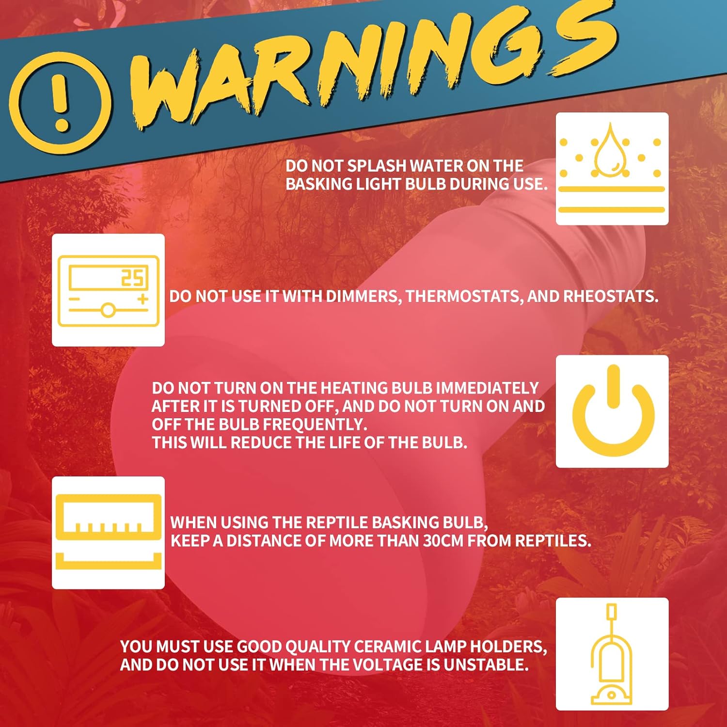 - ๐ฆSafety Instructions - You must use good quality ceramic lamp holders, and do not use it when the voltage is unstable. Do not use it with dimmers, thermostats, and rheostats. Do not splash water on the basking light bulb during use. When using the reptile basking bulb, keep a distance of more than 30cm from reptiles. Do not turn on the heat bulb immediately after turning it off, and do not turn the bulb on and off frequently.