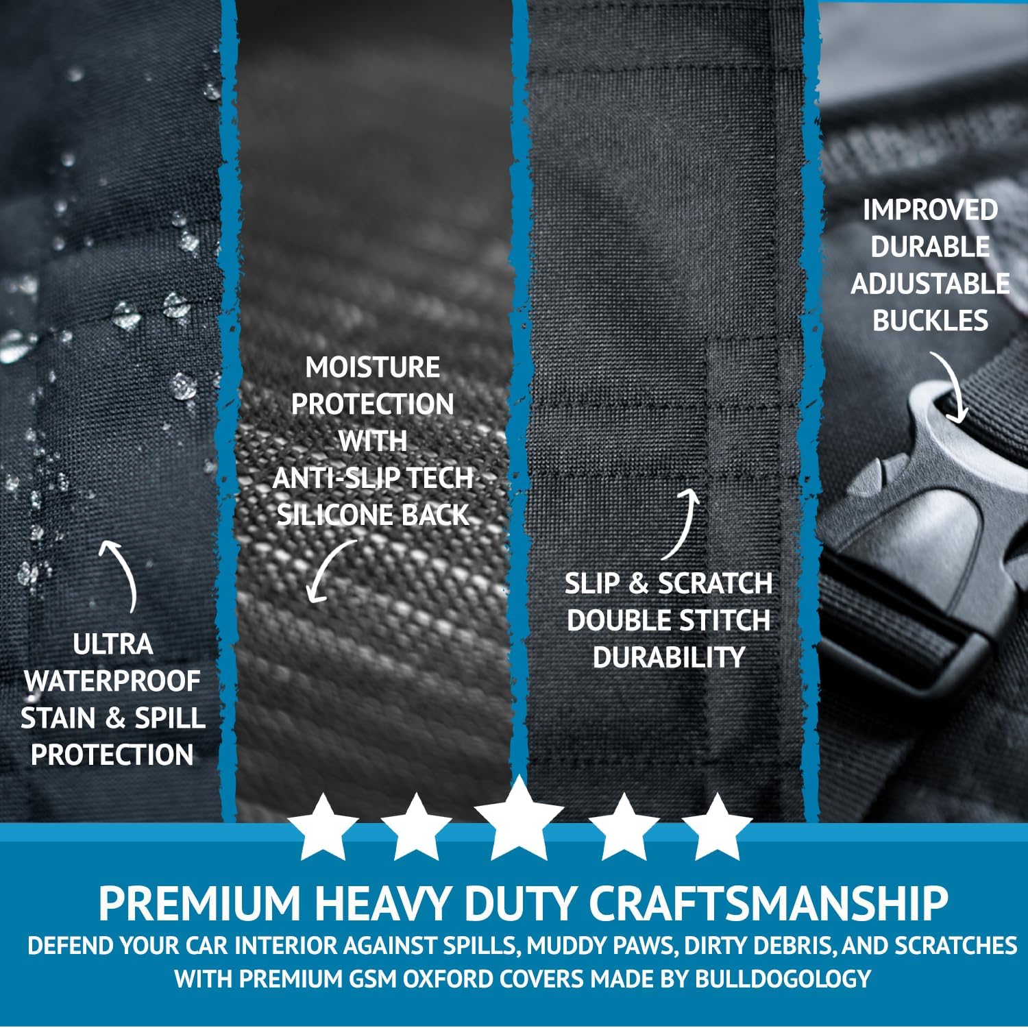 - HEAVY DUTY PROTECTOR: Defend your back seats against dog hair, muddy paws, dirty debris, and scratches. Bulldogology Dog proof Pet seat covers includes mesh window, zipper, full door side covers and extra thick layers for all-around protection. Regardless of what your pet may put it through, our dog car seat covers are crafted with double stitched quilted premium 600D GSM Oxford Material that Guarantees Lifetime Satisfaction.