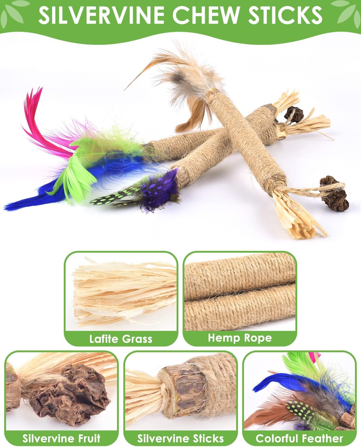 - 【Natural Silvervine Sticks】Our silvervine sticks are made from natural silvervine, raffia, sisal rope and gall fruit (fruit of silvervine), there are absolutely safe for cats to chew and bite.