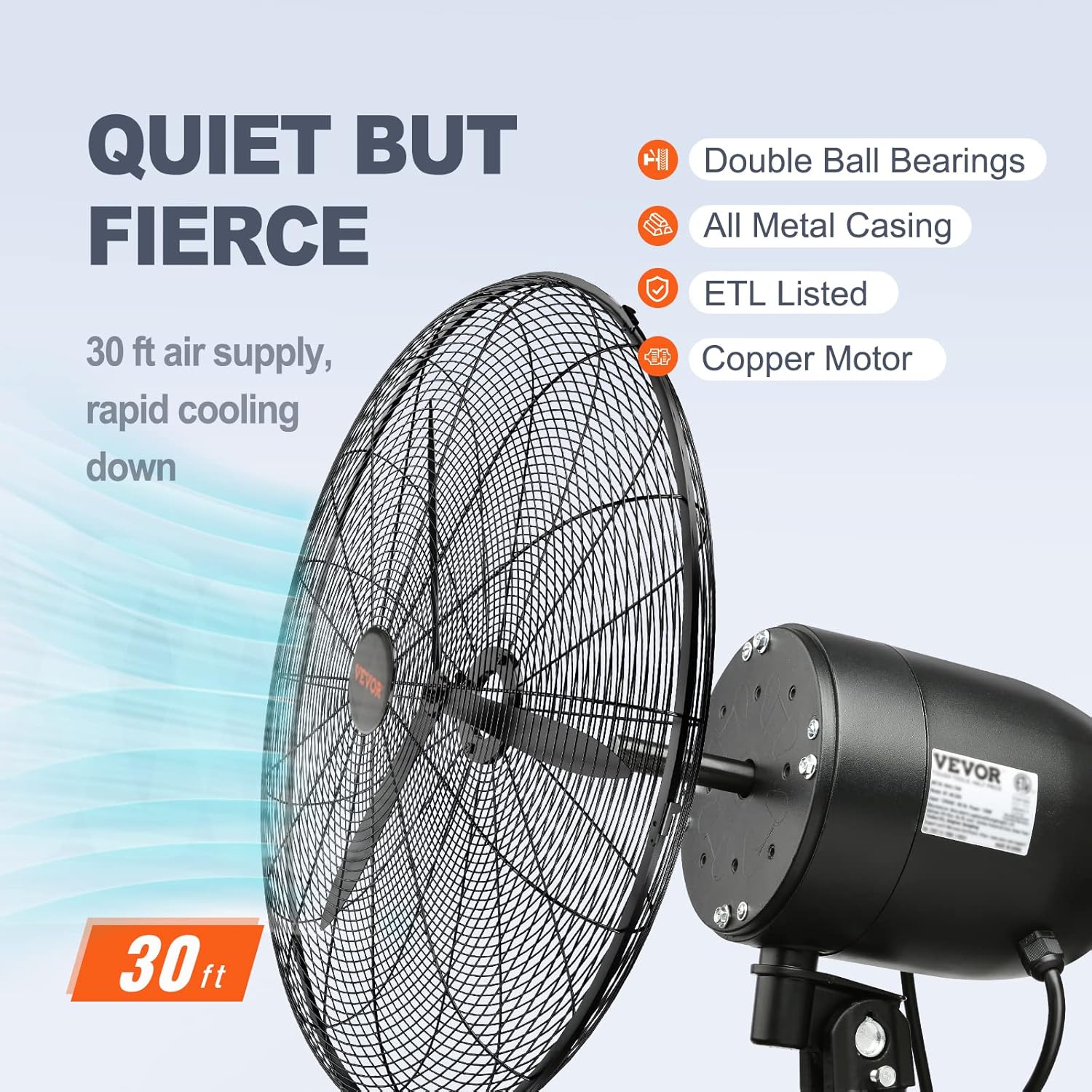 - Power without Noise: ETL listed. 1400 RPM, 150 W copper motor with all metal casing contributes to a farther air movement range at lower noise. Our wall mounted fan comes with 6 ft power cord for your maximum convenience. Keep flies away during relaxing summer days!