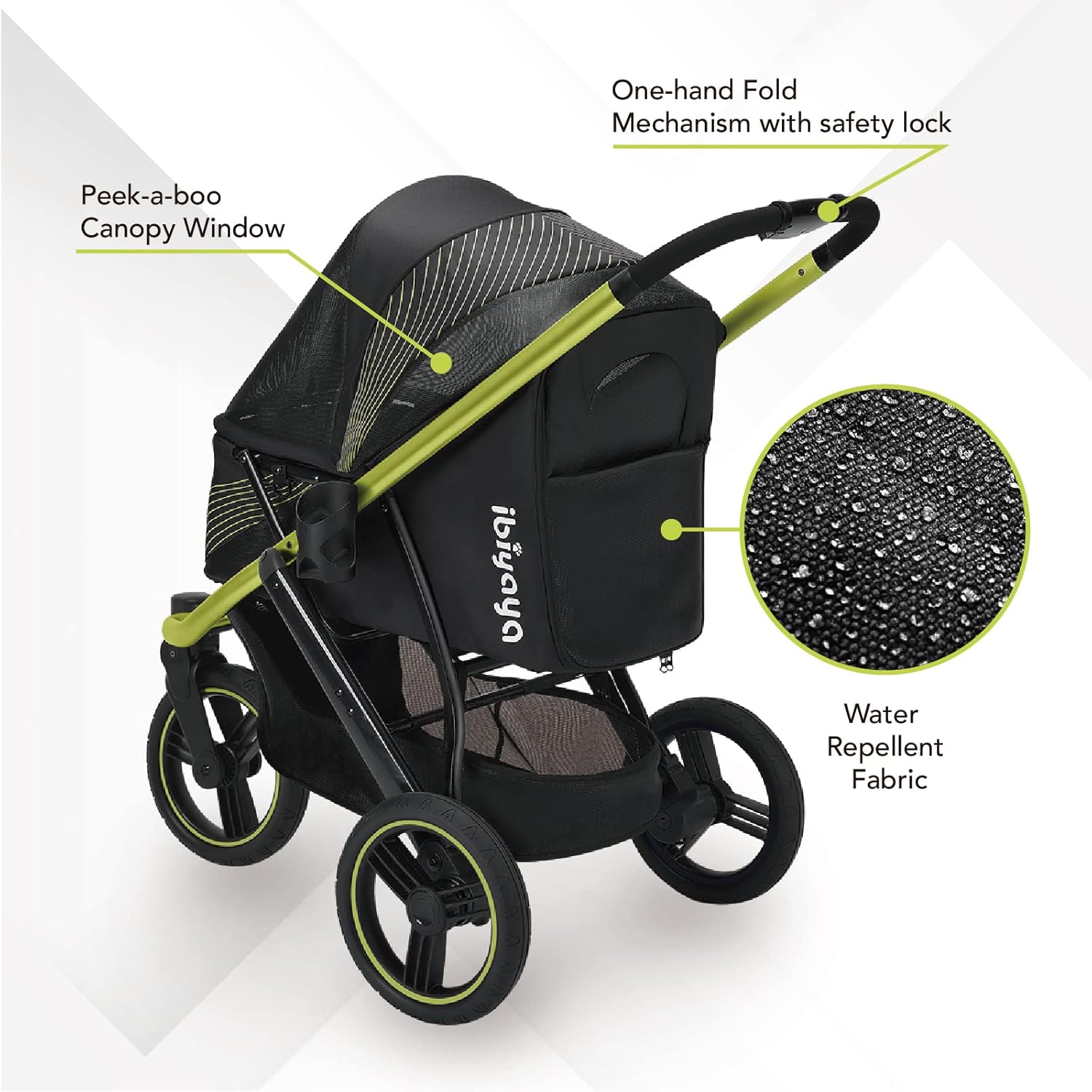 - STORAGE OPTIONS: Choose this large dog jogging stroller, and we assure you — you won’t have to bring several bags the next time you go out with your pet. Ibiyaya’s Beast Pet Jogging Stroller has several storage options, so you can bring your pet’s and your own valuables with ease. This all-terrain pet stroller has a large, durable bottom basket, storage pockets made from mesh, and a bottle holder on the side. Talk about hands-free trips, right?