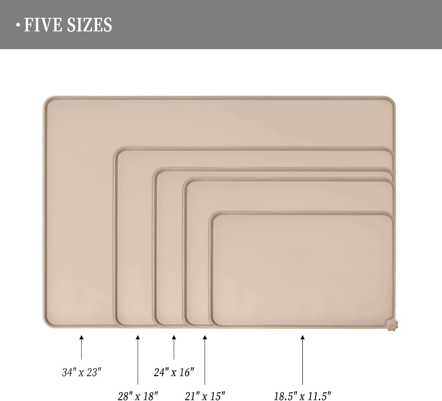 - Various sizes available: our pet mats come in 5 different sizes - 18.5" x 11.5", 22" x 14", 24" x 16", 28" x 18", and 32" x 24". Suitable for all kinds of pets, from puppies to large pets, choose the perfect size for your furry friends and avoid messy spills at mealtime