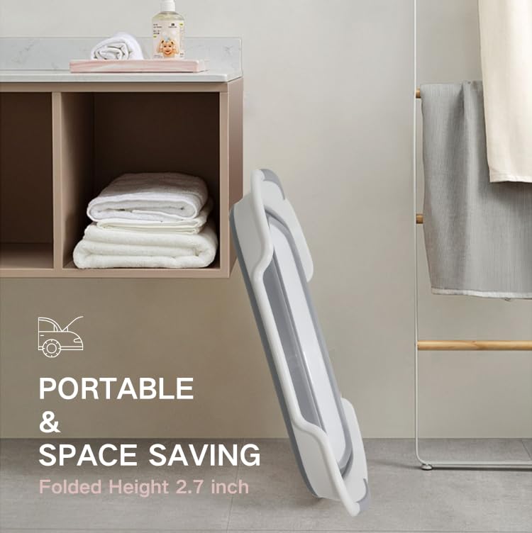 - 【Space Saving with Expanded Size】23.6 x 15.7 x 10.8 inches, 2.7 inches height when folding, you can easily hang it on the wall or storage it in narrow space where fits. This collapsible bathtub for newborn is about 2.8 pounds.