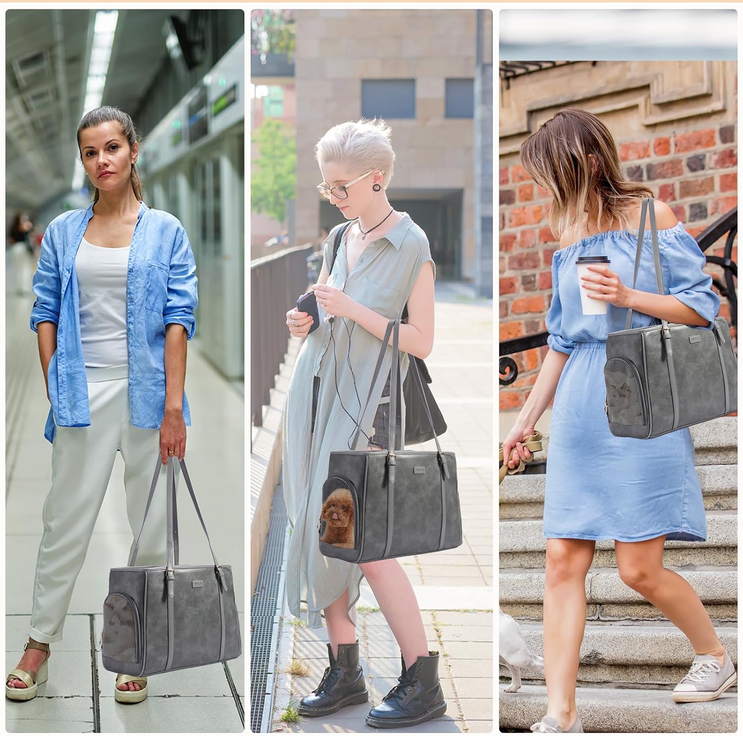 Fashion Dog Purse Pet Carrier Leather Bag for Small Dogs Cats Puppy, Portable Tote Bag Airline Approved Soft-Sided Carriers (Grey)