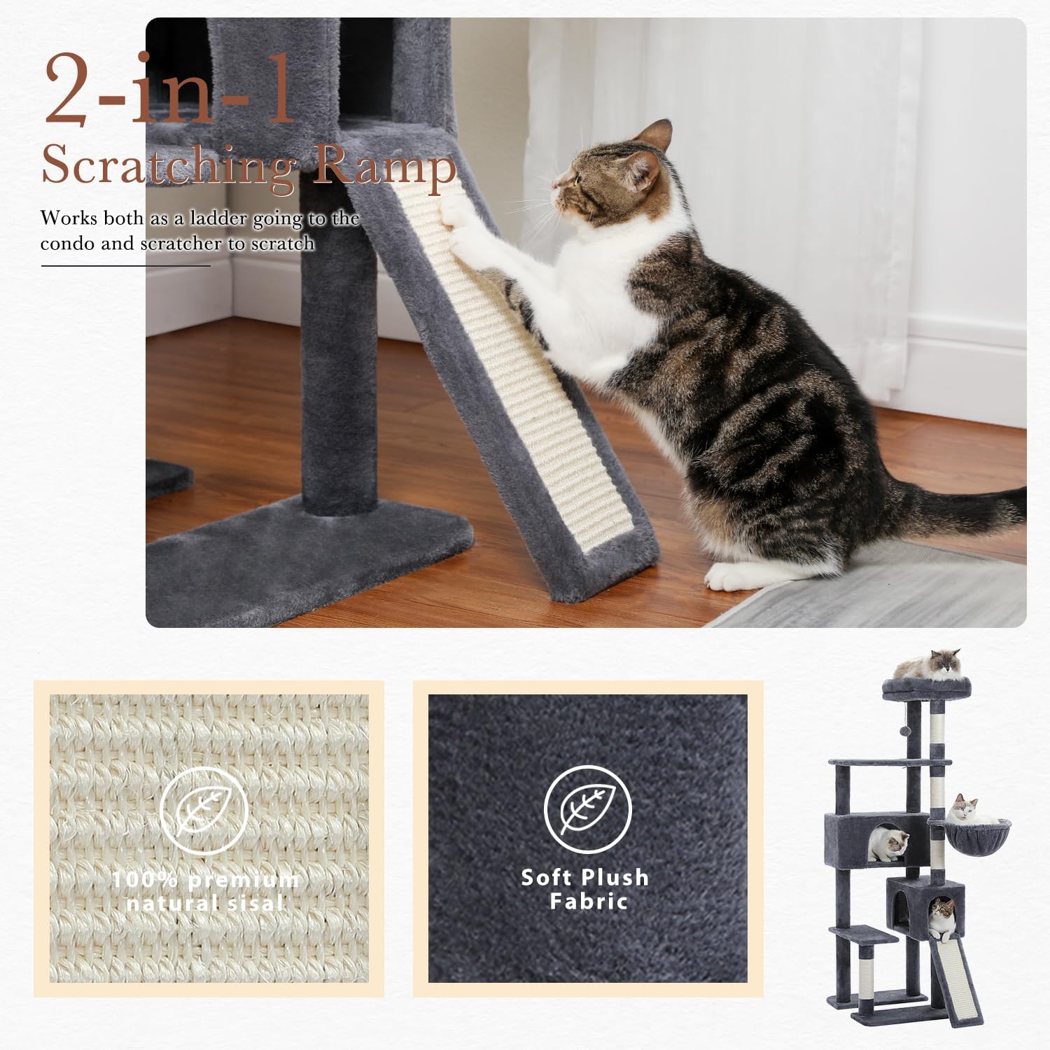 - Durable and Strong: The needs of scratching can be fully satisfied! 100% natural sisal covered posts for fufiling your furries’ scratching nature. And the 2-in-1 ramp works both as a ladder going to the condo and a scratching board to fully scratch, not only maintains your furries’ nail health, but also saves your furniture from daily scratching.
