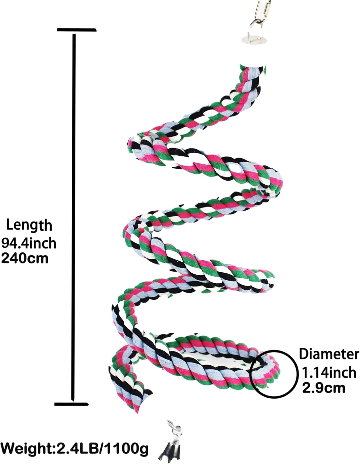 - ๐ฆ[WHAT YOU GET] 1pc 94.4inch length soft cotton spiral rope with metal bell,fully closed/open hook can hang in birdcage or outside safety,bendable internal steel wire can re-sharp it provide more fun for your pets
