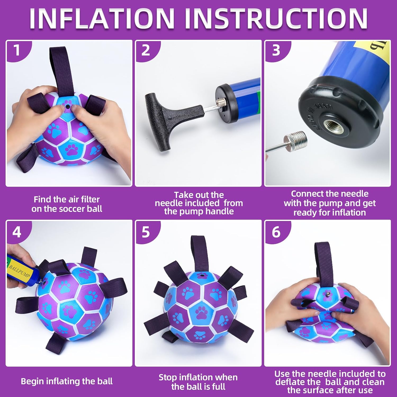 - Pump & Needle Adapter included: The herding balls for dogs comes delated. There's a needle point adapter and apump inside as well while other items in the same market only include a bal needle. The soccer ball dog toy is 8inches in dlameter, perect for large breeds, not for aggressive chewers.