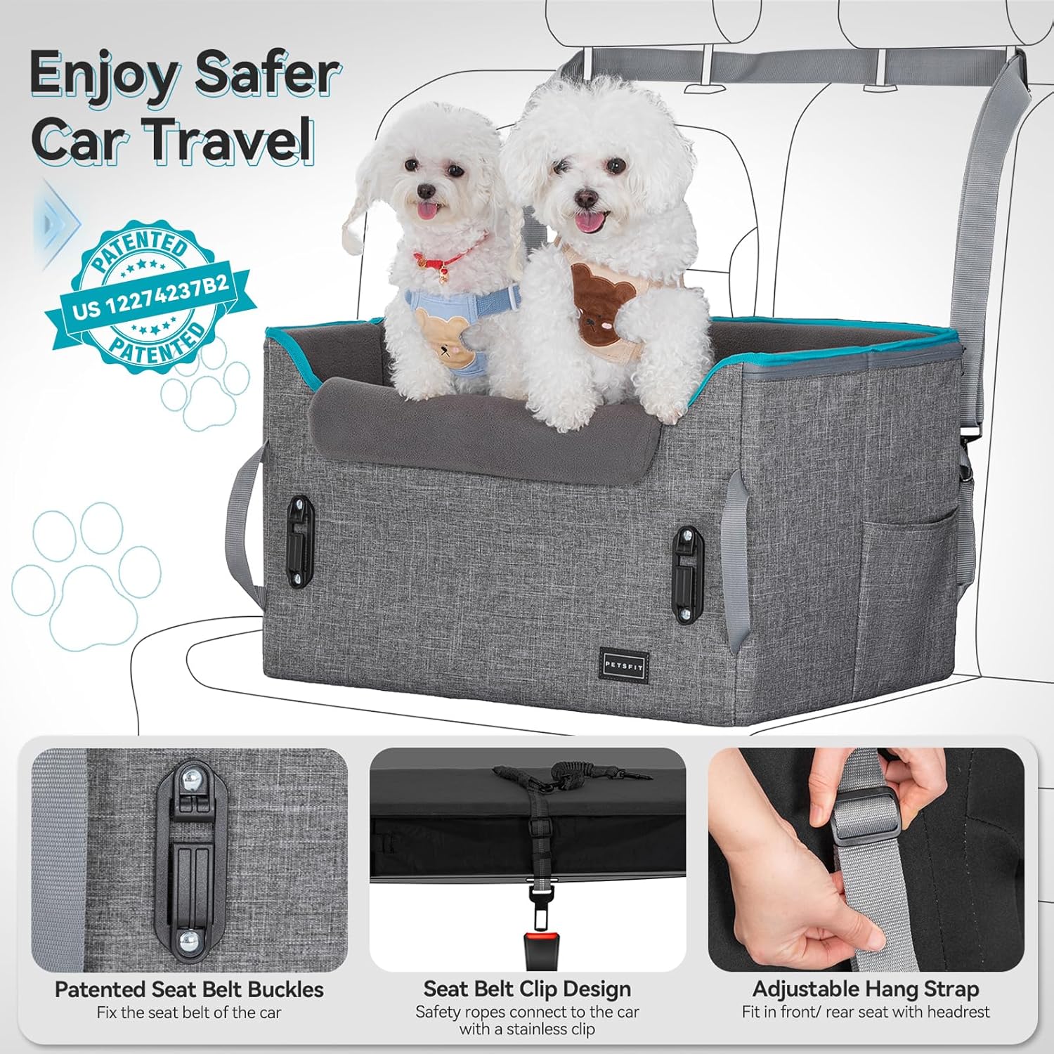 PETSFIT Dog Booster Car Seat for Small/Medium Dogs, Dog Car Seat for Medium Sized Dog with 2 Clip-On Safety Leashes and Patented Buckles, Pet Car Seat with Storage Pockets for Pets Under 45Lbs (Grey)
