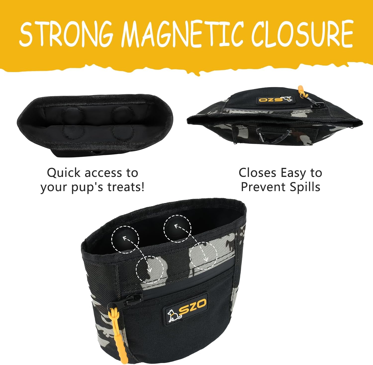 - Easy To Use — SZO dog treat pouch is designed to fit your everyday use when training your pets. It features a magnetic closure, allowing quick and one-handed access to your pet's favorite treats. And a front zipper pocket to secure personal items!