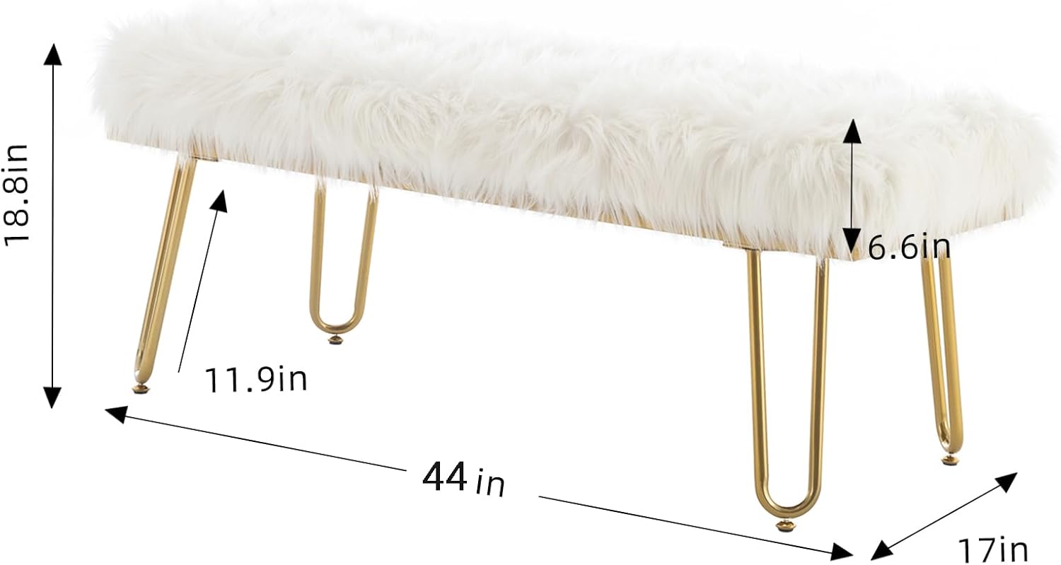 - Comfortable and Durable: Our ottoman bench combine soft white faux fur with solid bench legs. Thick cushioning creates a plush place to sit or to rest your feet, while the sturdy base offers added stability. The fluffy fur makes the chair look delicate, comfortable. And it's pretty easy to install, simply fitting the four stool legs onto it with a screwdriver. There are 4 diferent materials of the bench legs for you to choose you can choose your favorite one according to your needs.