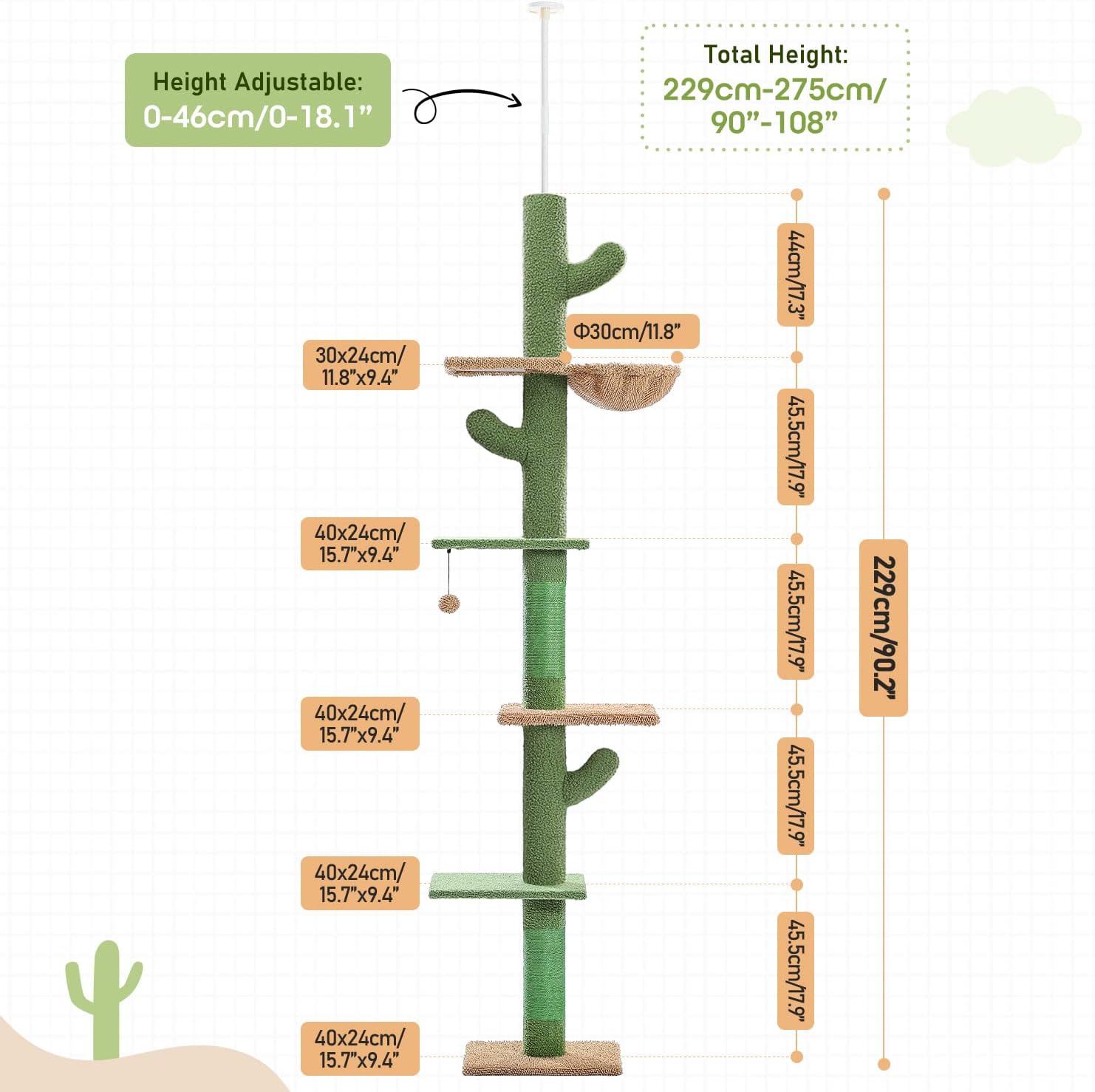 PAWZ Road Cat Tree, Cactus Floor to Ceiling Cat Tower with Adjustable Height(95-108 Inches), 5 Level Cat Climbing Tower with Cozy Hammock, Platforms and Dangling Balls for Indoor Cats