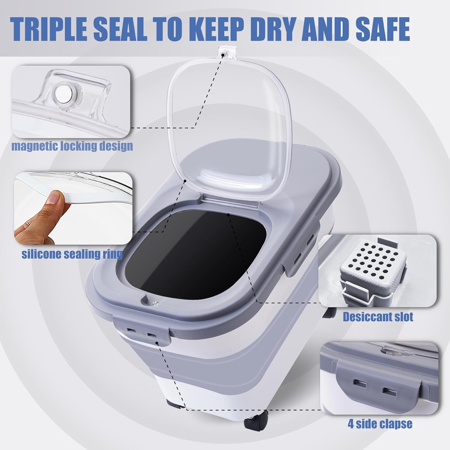- 🍚【Sufficient capacity】 Our containers are like treasure chests for foods! With a convenient foldable design, they offer a unfold size of 16.54 “L x 10.15” W x 12 “H, to store up to 23 pounds of dog food or 25 pounds of rice. And when you need to take them on the go or save some space, simply fold them down to a size of 16.54” L x 10.15" W x 5.5" H, able to hold around 6.5 pounds of dog food or 8 pounds of rice.