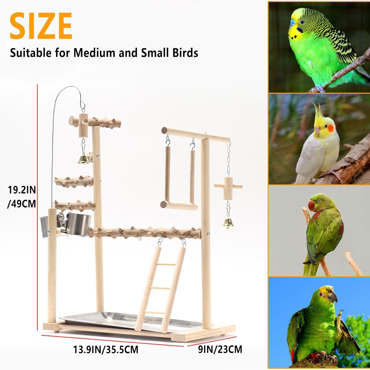- 【Suitable for Various Bird Species】: Measuring at 13.9"x9"x19.2", the assembled parakeet playground is suitable for small and medium-sized birds such as parrots, parakeets, cockatiels, lovebirds, conures, budgies.