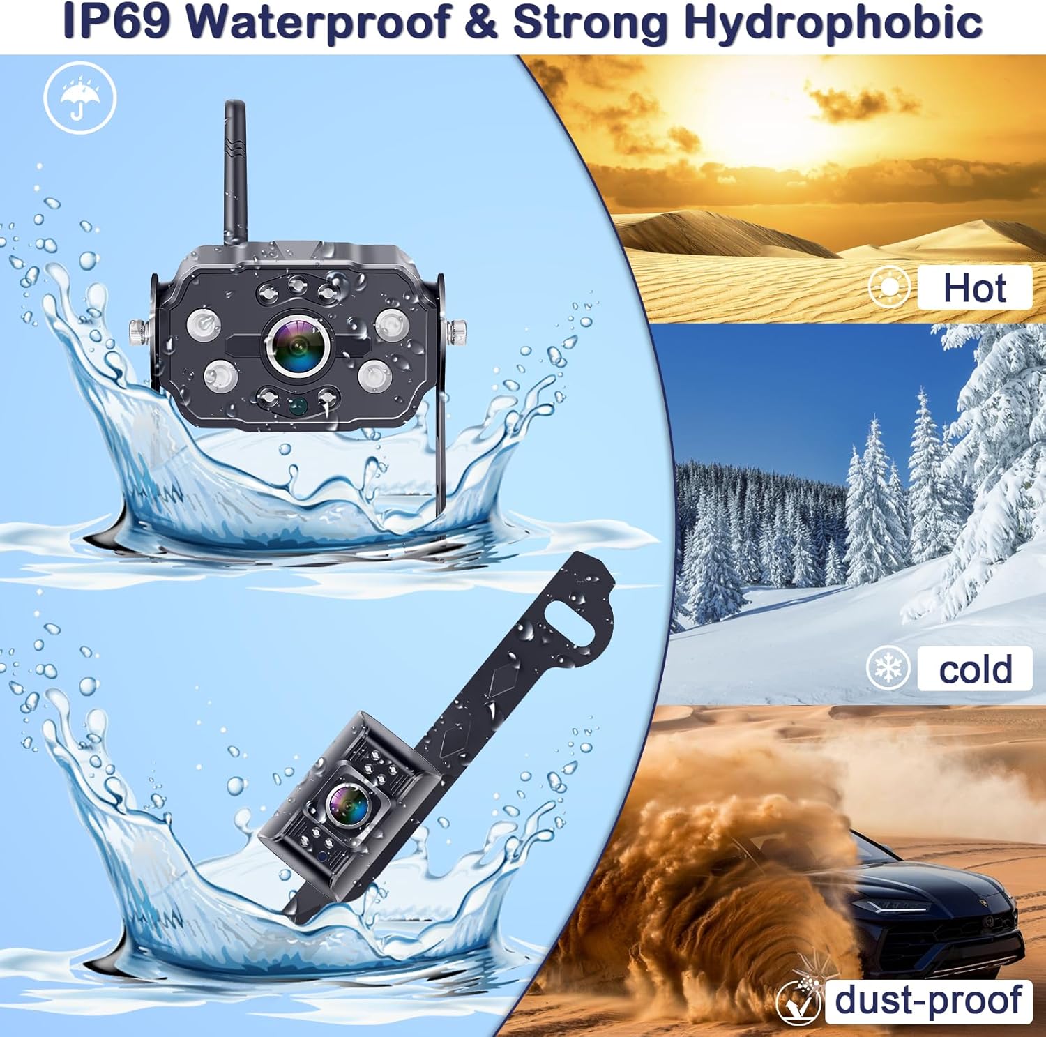 - 100% Waterproof: The backup camera for rv utilizes the latest nano-coating sealing technology with IP69 grade waterproof performance, which can work perfectly and provide clear images in extreme environments from -22°F to 176°F. This rv camera system wireless is like a brave guardian from any water or fine particles, tenaciously resisting wind, rain, dust, high and low temperatures, which enhances the safety index and strengthens the service life, providing a safer guarantee for driving.