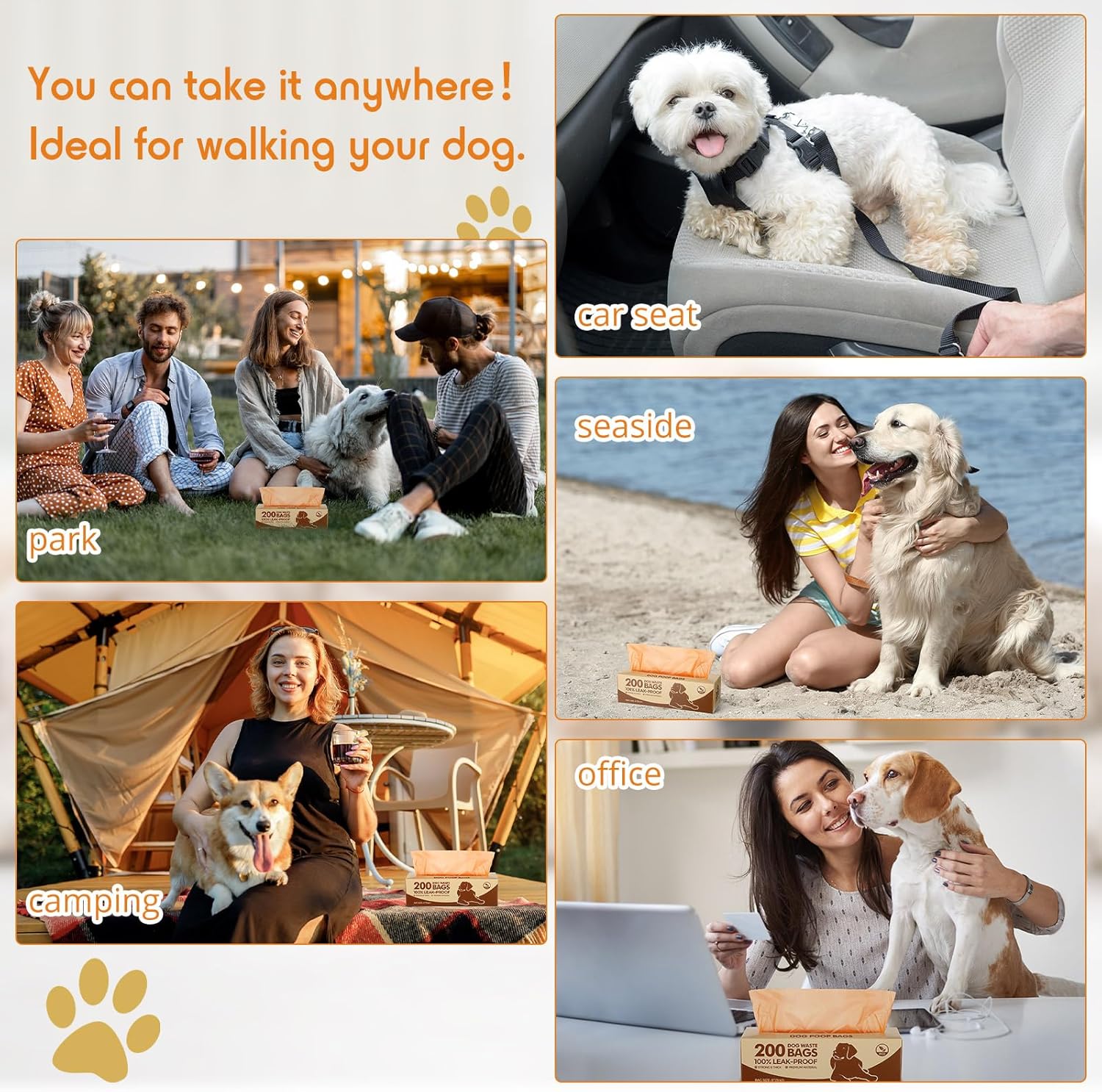 - Easy to Use: the doggie bags for poop saves time and hassle by simply pulling it out of the box when you need it, pull off the perforated panel to dispense the bags, one bag is pulled out and torn at the perforation for use, bring much more convenient in your daily life, don't need to search around for pet waste bags while walking your dog outside
