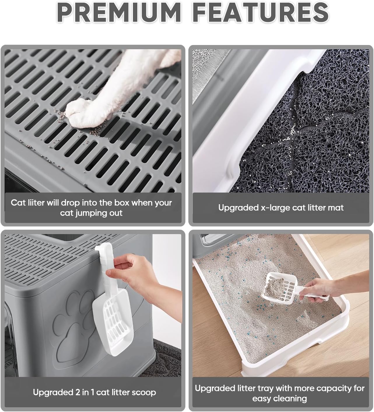 - [Easy to Clean] - The upgraded pull-out drawer design litter tray and included 2 in 1 litter scoop make cleansing of litter a lot easier. Easy for cleaning the feline clutter with minimal mess. Mat is easy to clean with a non-slip back, also suitable to place under feeding bowls to catch spill