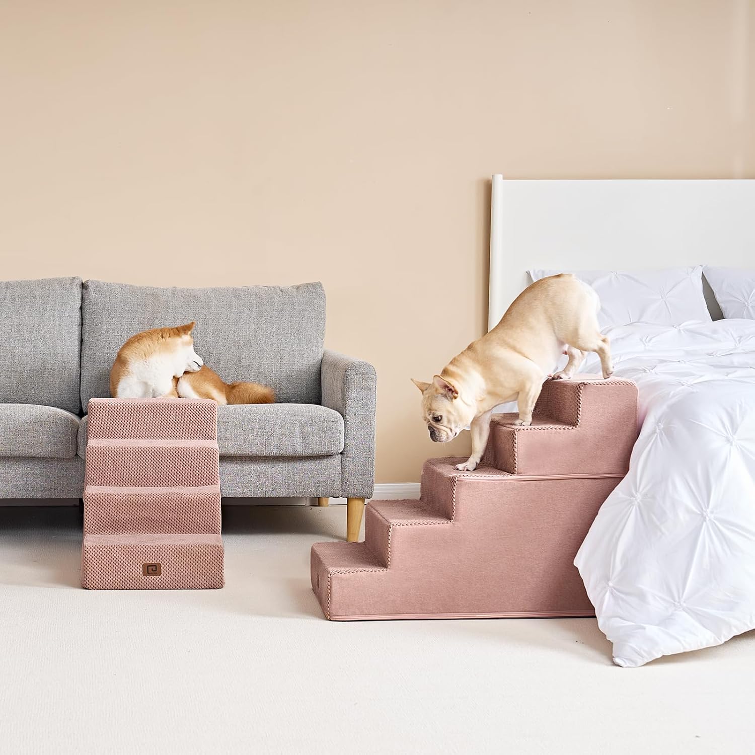 - MULTIPLE STEP SIZES - This dog stair comes in 3, 4, and 5-step options. Our 3-step pet stair is ideal for sofas and low beds (up to 18 inches high), while the 5-step version is better suited for higher beds (up to 27 inches). If your bed is of medium height (up to 23 inches), please select the 4-step one.