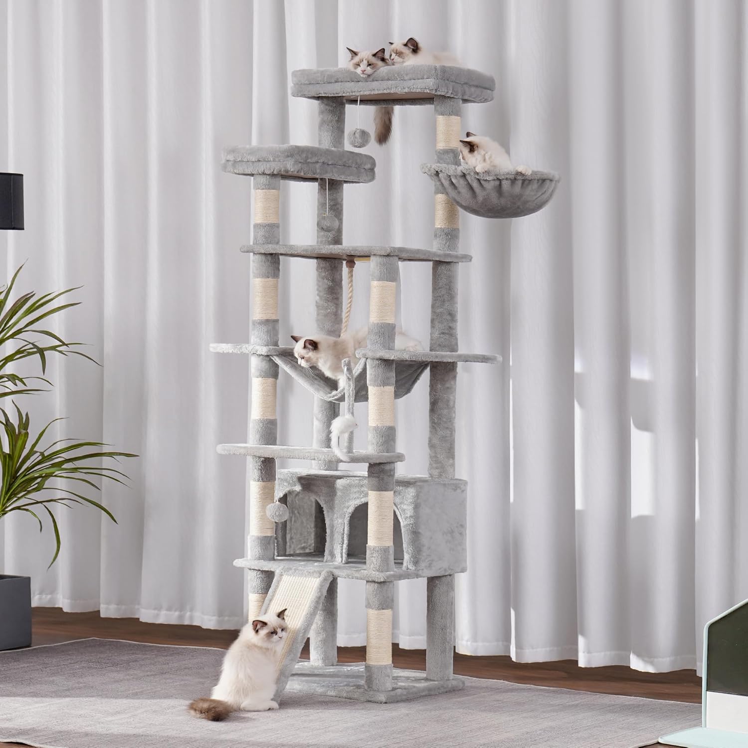 - [78" Tall, Multifunctional Design] Step-like jump multi-layer structure design of cat furniture, convenient for cat's scratching, climbing, sleeping, and exercising; The big cave, basket and hammock offer private space for catnap or hiding; Hammock to lounge and enjoy the leisure time
