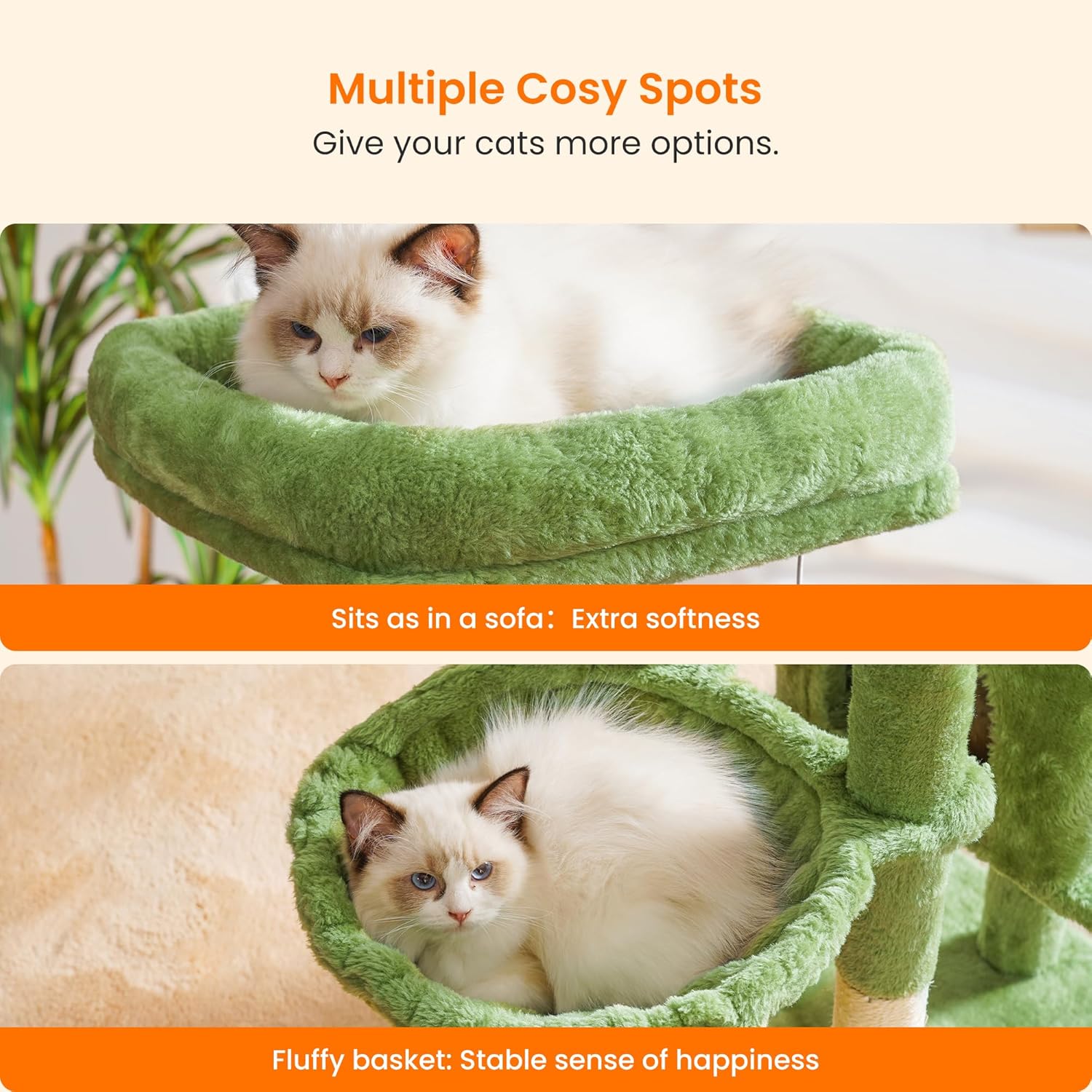 - Ideal design of structure: Structure of the cat tree is designed according the climbing habits of cats. Two jumping platforms not only increase the active space but also help kitties and older cats to climb up and down
