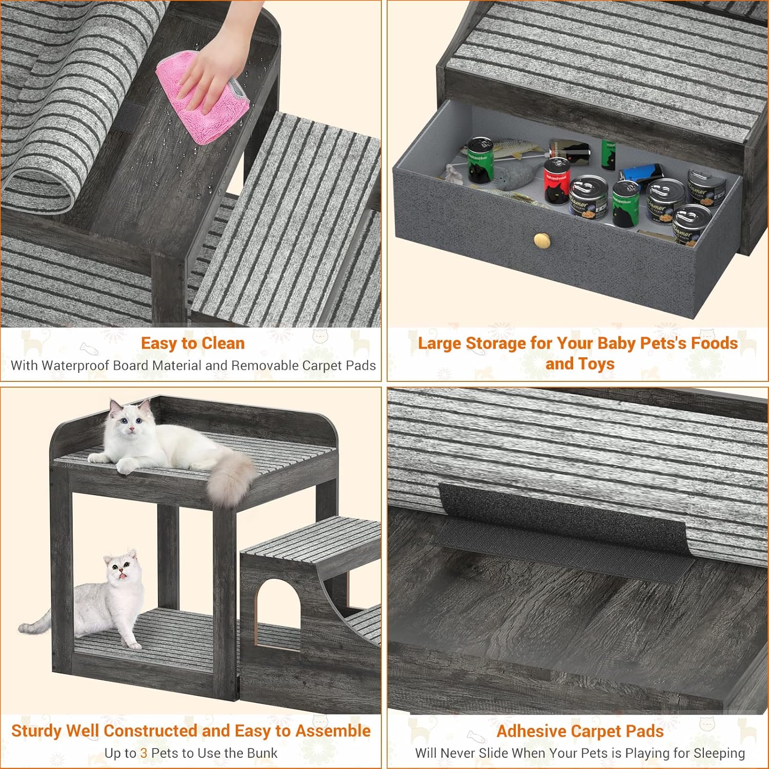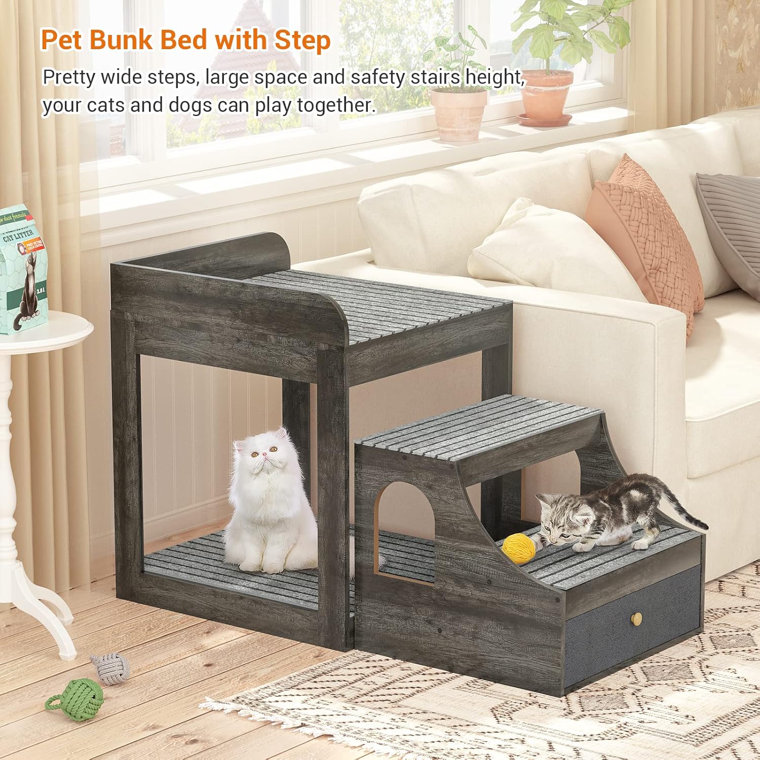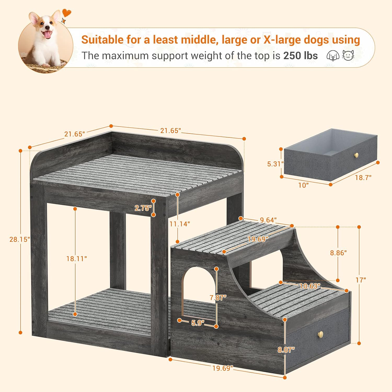 - ๐พ Large Space with a Storage Drawer - The space underneath the bed is large too, so your dogs and cats can play together. The top bed space is 17.72*17.72 inches, providing a safe and large space to lie down and rest. It can hold up to 150 lbs. The drawer underneath the stair is large too, you can install your pet's toys and food too.
