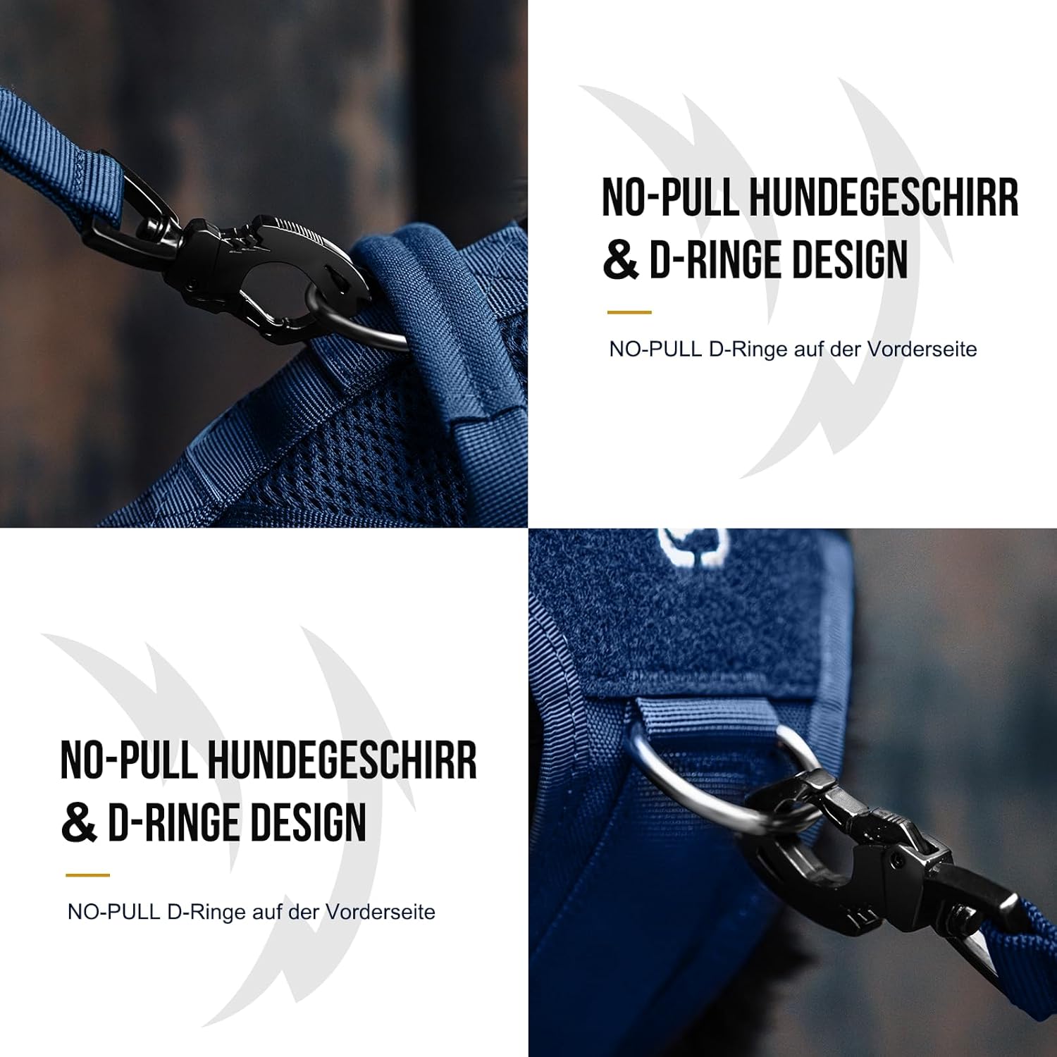 - [No Pull D-ring]: 3 stainless steel D-rings at the front chest and back for training, short and long leashes, with 4 UTX-Duraflex quick-release buckles and 6 fully adjustable straps.