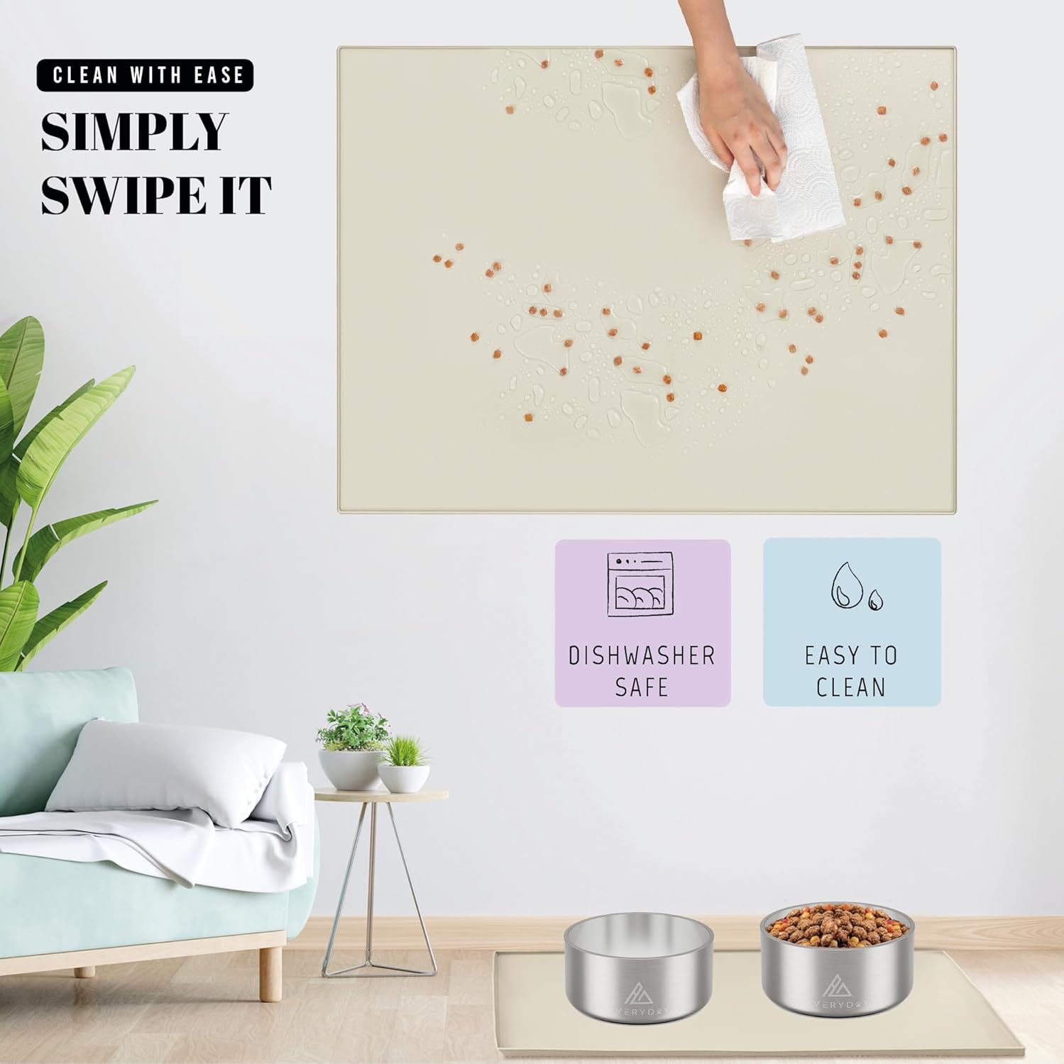 - Non-Slip Design: No more sliding bowls! AVERYDAY's heavy-duty pet mat stop bowls from sliding during meals. The dotted surface boosts slip resistance, ensuring your pets' food and water bowls stay securely in place