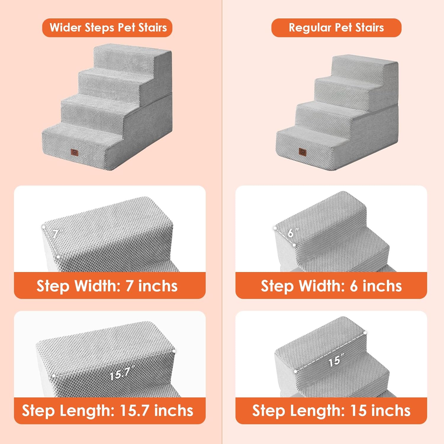 - MULTIPLE STEP SIZES - This dog stair comes in 3, 4, and 5-step options. Our 3-step pet stair is ideal for sofas and low beds (up to 18 inches high), while the 5-step version is better suited for higher beds (up to 27 inches). If your bed is of medium height (up to 23 inches), please select the 4-step one.
