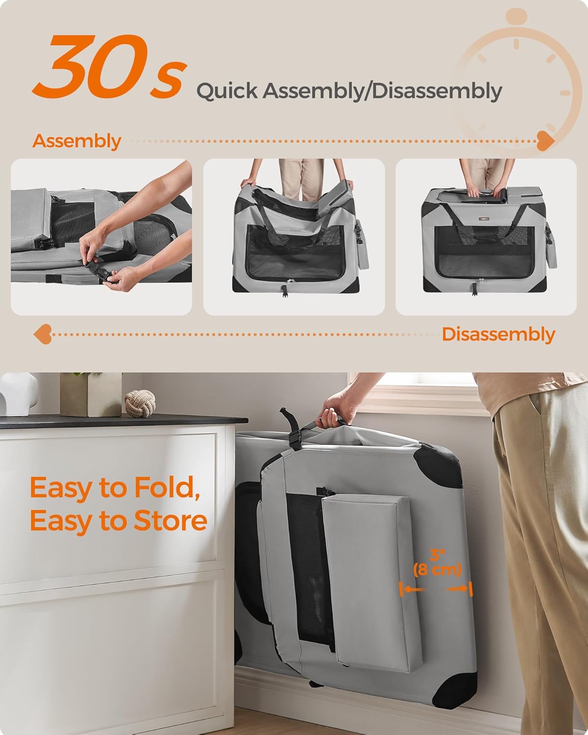 - 【QUICK ASSEMBLY & EASY FOLDING】The dog crate can be assembled in 30 seconds without tools and can be stored in the car or in the corner of your home after folding. It can be easily carried for indoor use or traveling, giving your dog a warm home anytime