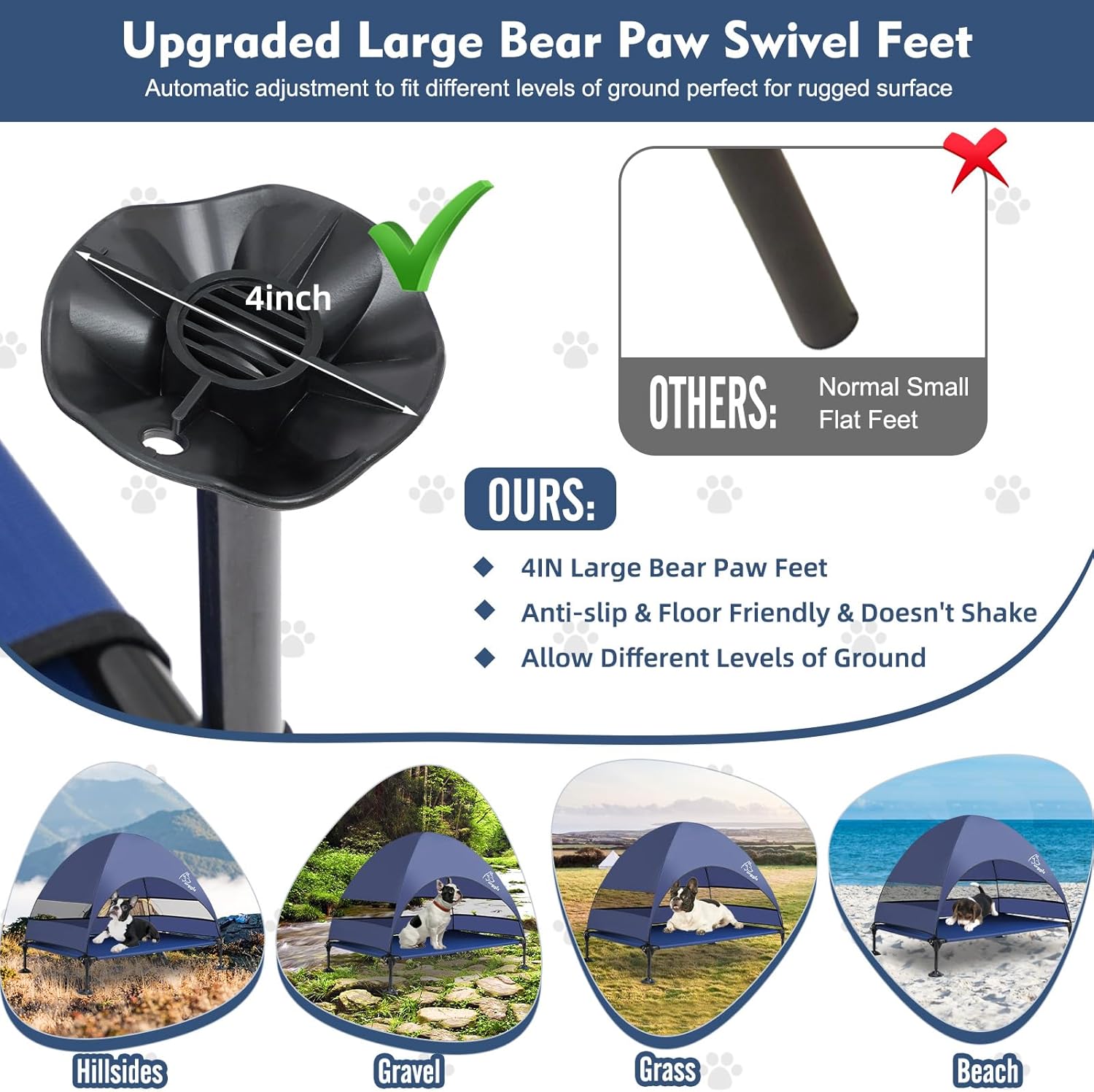 - Super Stable Elevated Dog Bed with Unique Bed Feet: We call these unique bed feet "Bear Paw" or "Lotus Leaf", 4' wide to create large contact area with ground, special bottom structure to increase grip, it stands much more stable than normal pet beds. With a joint ball holding each foot and post, the feet can automatically adapt to different levels of grounds, thus to stand still on rugged grounds beach, hillsides, grass, gravel and almost anywhere you'd paced it! Even when dogs roll around!