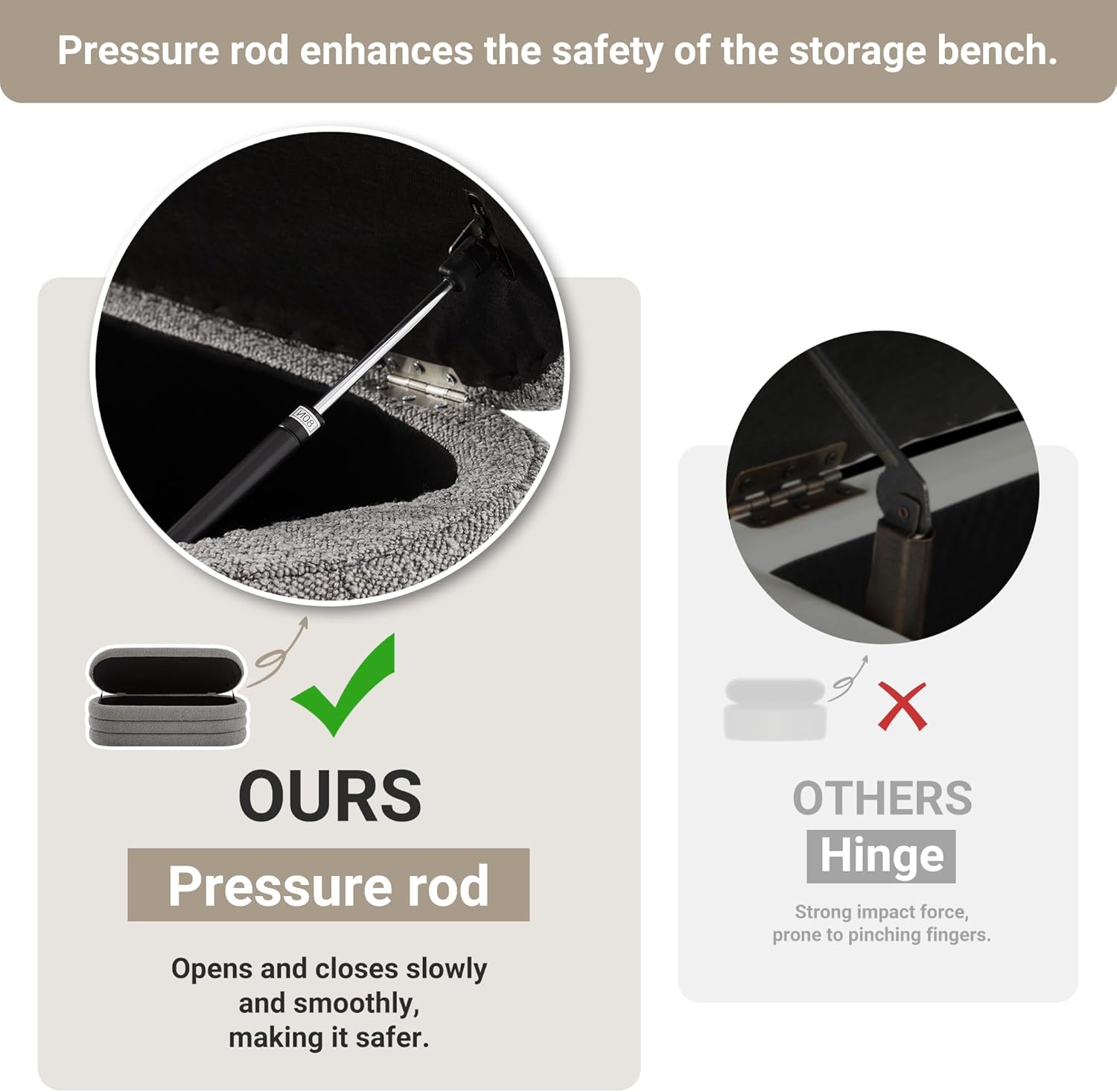 - Safe and Rounded Design: The ottoman bench features a safe and effortless pressure bar design for easy lifting. Its rounded appearance helps prevent injuries to children during play, making it suitable for families with kids.