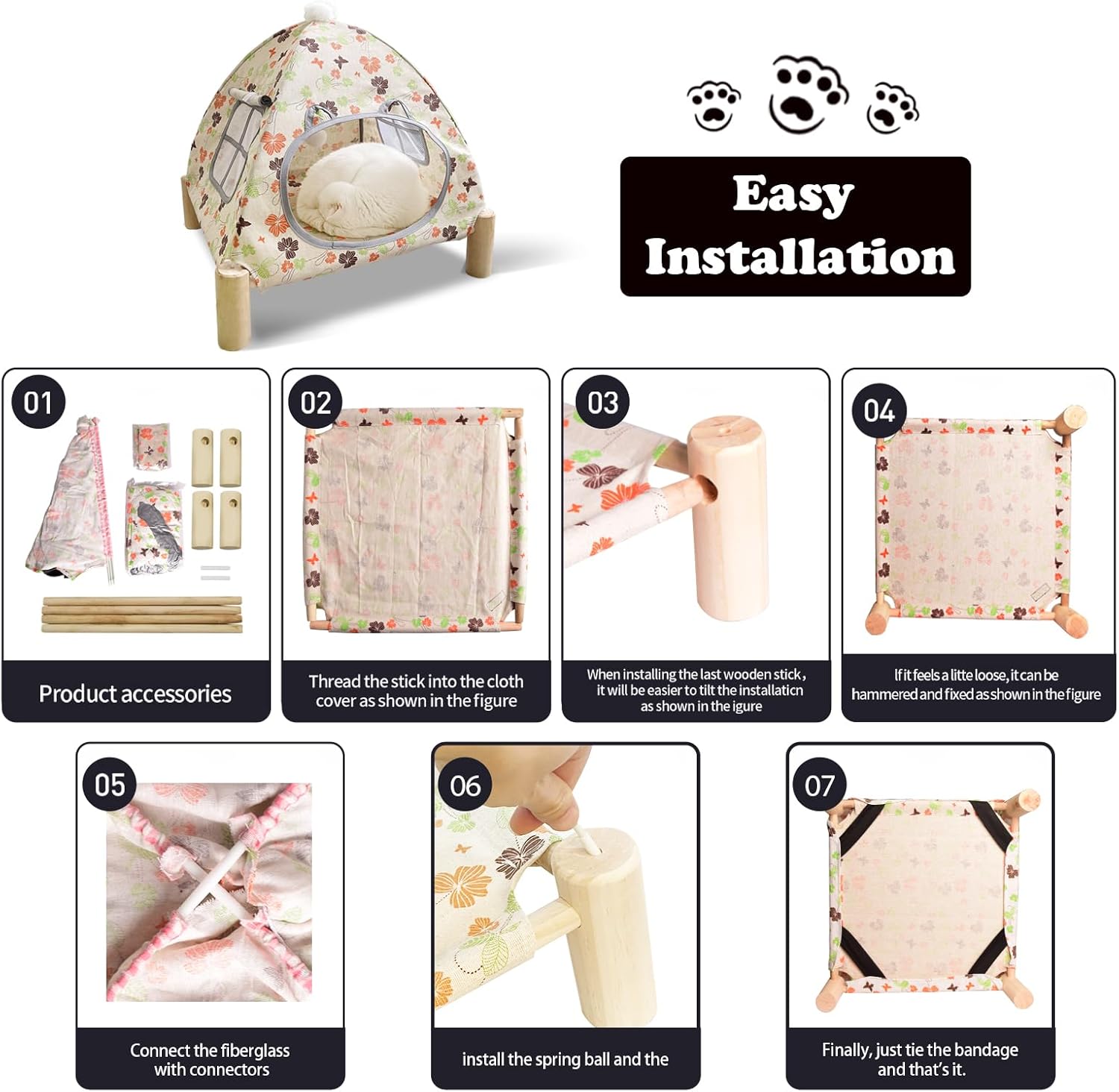 - PINE TREE MATERIAL FRAMEWORK: The supporting wooden poles of animal tents are made of polished natural wood. It is solid, healthy, safe, and safe. Make your beloved pet healthy sleep and suitable for Outdoor Cat TENTS for Indoor Cats.