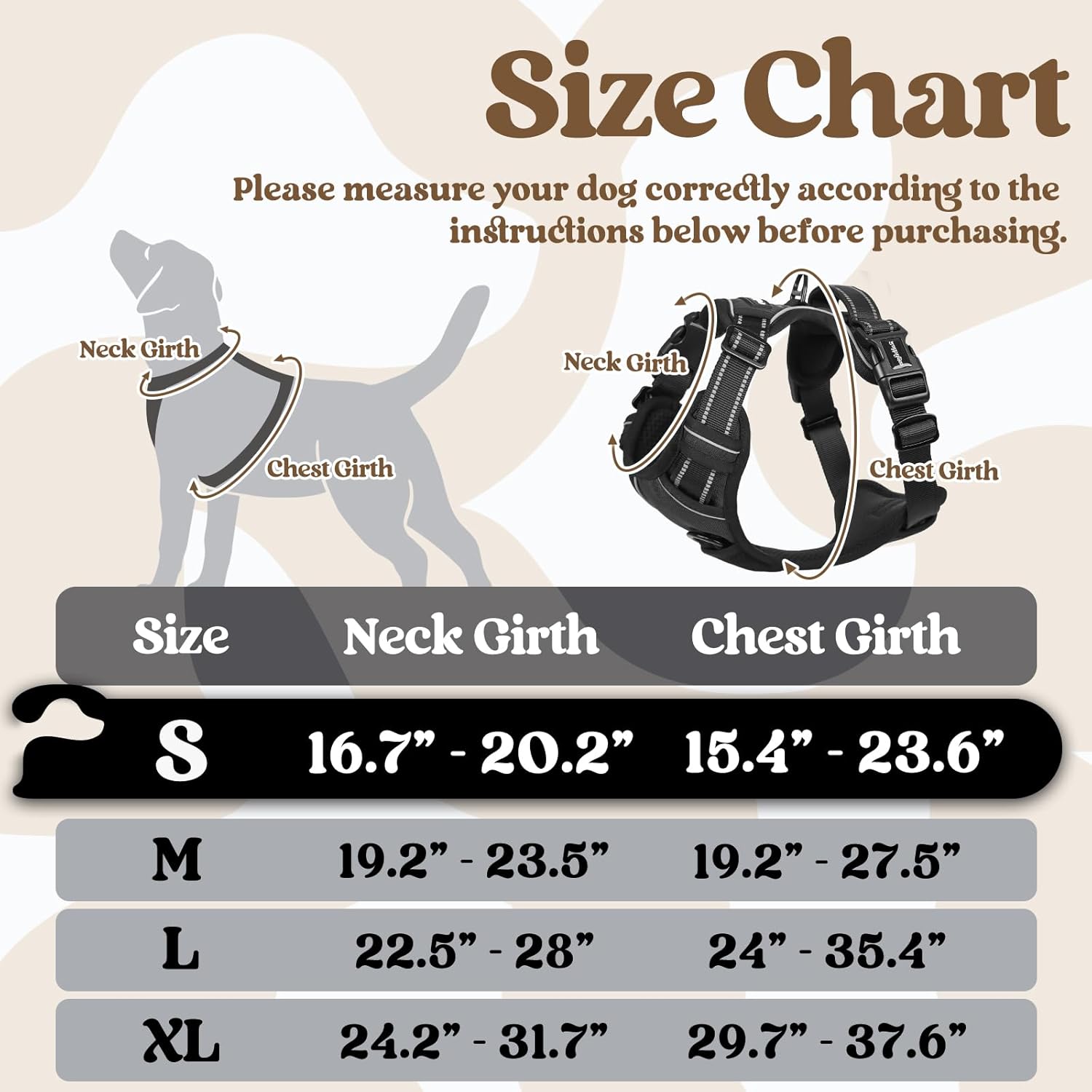 - Create a Snug Fit: 4 fully adjustable straps suit most breeds, fitting while allowing freedom of movement. The adjustable two chest straps and two neck straps were created specifically for dogs going through a fast growth period. Size information: 16.7"- 20.2" Neck Girth, 15.4"- 23.6" Chest Girth