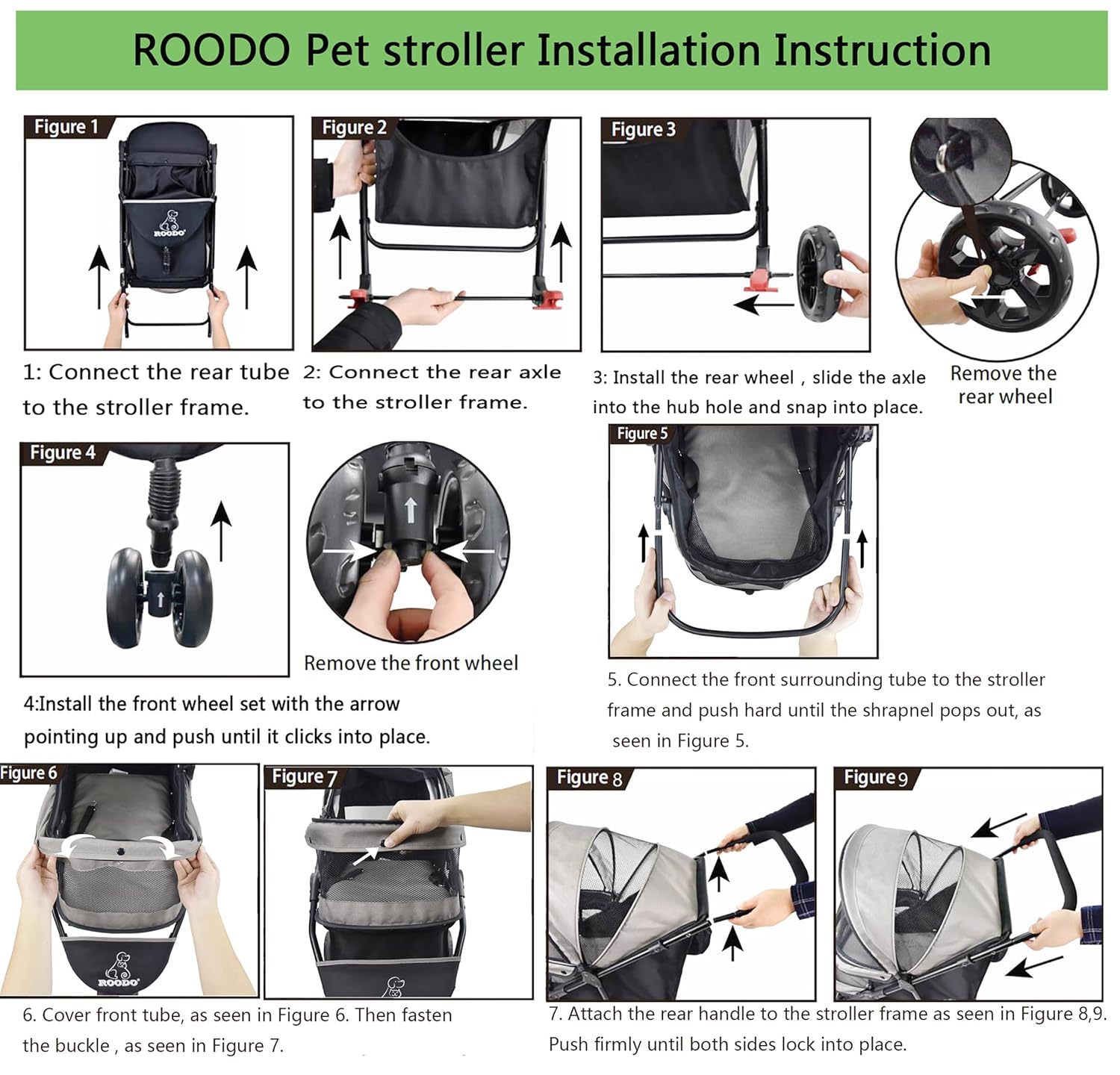 - ROODO multifunctional 4wheel pet stroller is smooth and easy to use. The pet rest area is covered with multi-directional breathable nets to enjoy the fresh air and protect your pets from insects. Equipped with a storage basket for easy storage of items. The pet stroller can be folded easily and compactly enough to fit into the trunk of the car. It is a great choice to bring your pet, walk, jog, travel and enjoy the outdoors together.