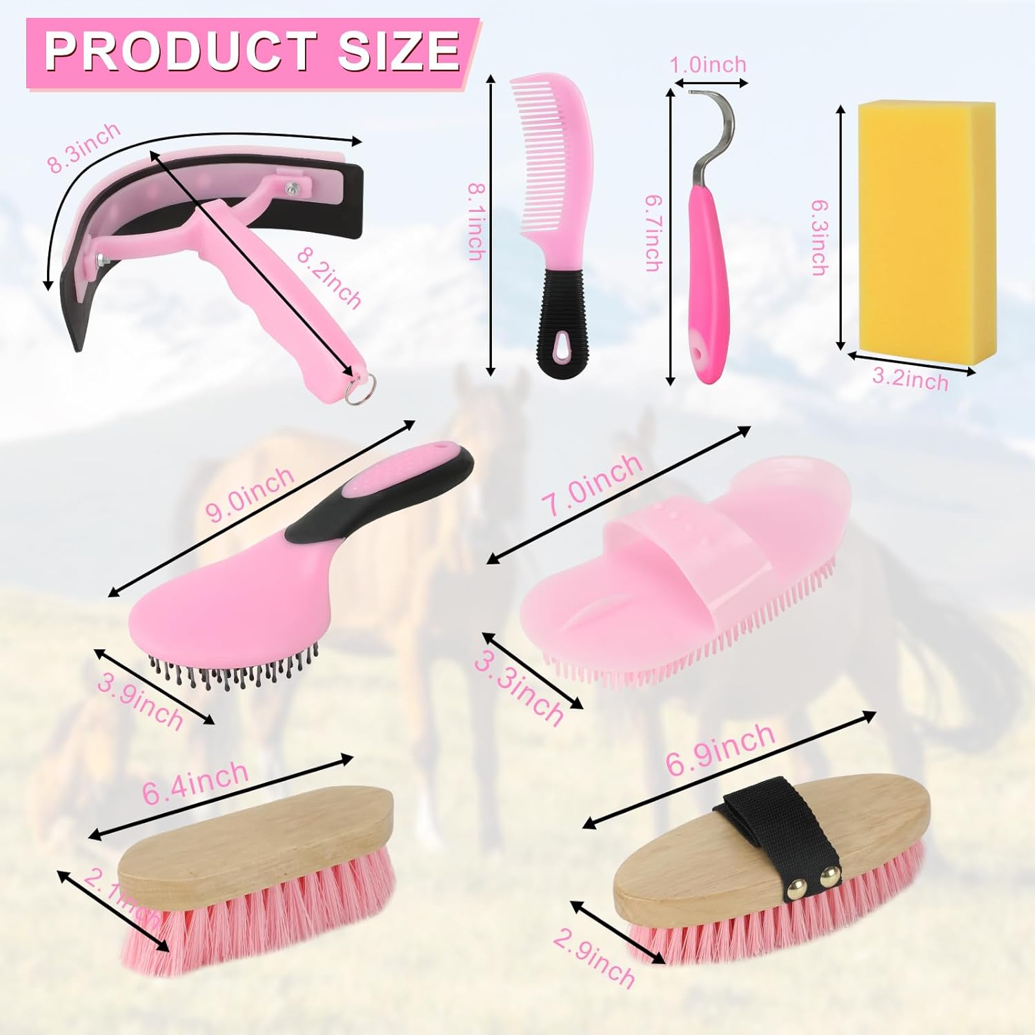- 9 Pieces package contains:The horse grooming supplies, includes a horse grooming tote bag, a oval massage curry, a hard brush, a soft brush, a sweat scraper, bathing sponge, a hoof pick , a mane comb and a tail comb