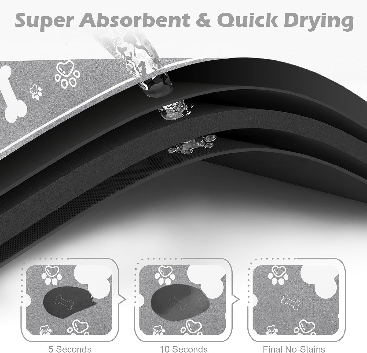 - Super Absorbent & No Stains: This pet feeding mat is extremely absorbent and dries quickly, absorbing any spilled water and milk,protecting your floors from stains and damage. Say goodbye to messy feeding areas and hello to a tidy, organized space that both you and your pets will appreciate.