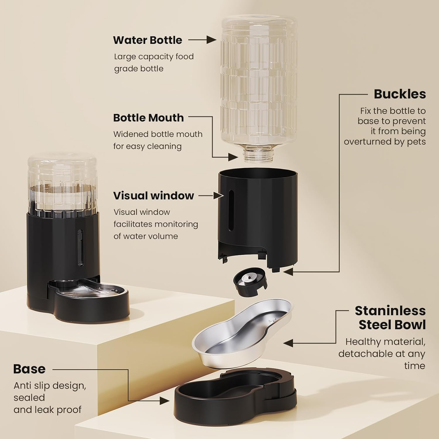 - [Drinking Safe] We take care of pets' drinking water health. The water bowl is fully attached to the base and made of food grade 304 stainless steel. Other components also use pet friendly materials.
