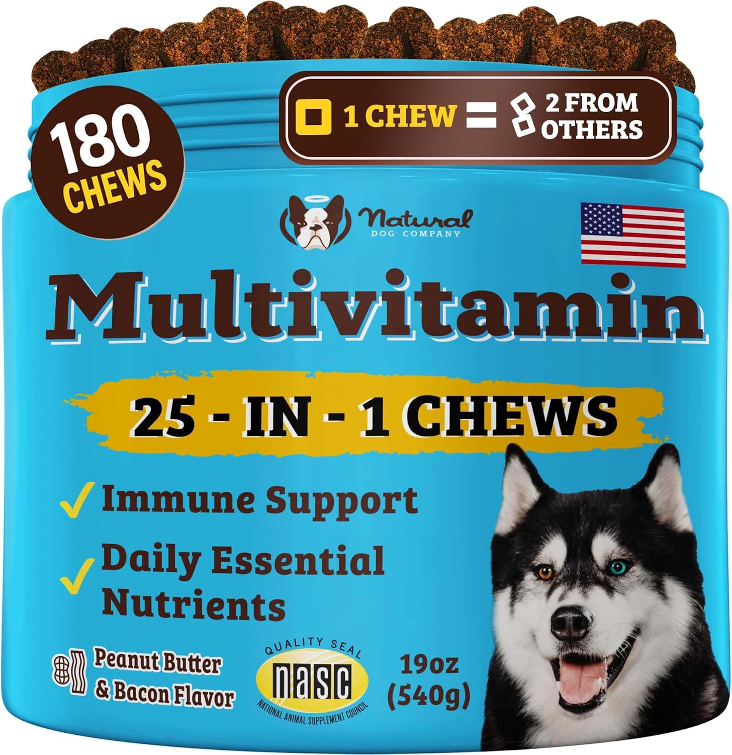 Natural Dog Company 25-in-1 Multivitamin Chews for Dogs – 180 Count Value Pack – Daily Soft Dog Vitamins with Antioxidants, Zinc & Folic Acid – Supports Joints, Skin & Coat, Immune & Heart Health