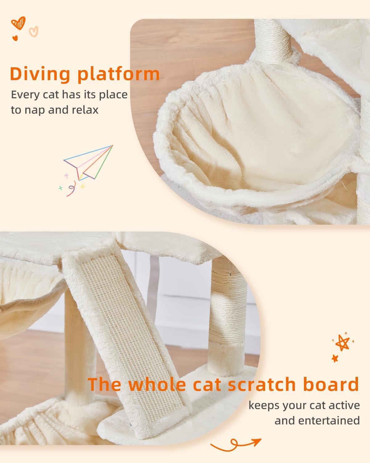 - 1.All-in-one design: There are 5 floors with 2 soft tops, 1 spacious cat apartment, 1 sisal ramp, 1 hammock and 1 hanging basket, natural sisal scratching posts and skin-friendly plush, and a multi-functional cat tree that attracts cats to play and rest.