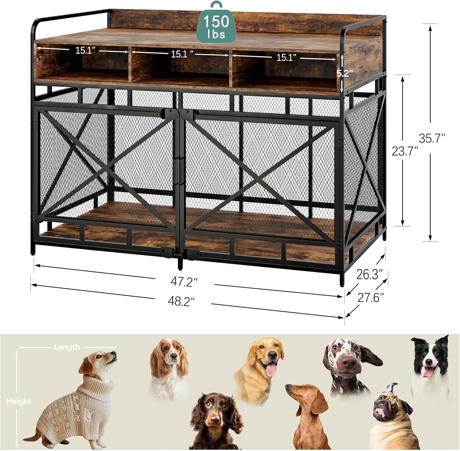 - Spacious & Secure Dog Crate for Large Dogs: The extra large dog crate has generous dimensions of 48"L x 28"W x 36"H. Ideal for one large dog or two smaller dogs, this large dog kennel furniture indoor ensures ample space for them to stretch out comfortably. Before purchase, be sure to measure your dog to guarantee they have enough room to move around, lay down, and sleep comfortably, so this wooden dog crate is perfect for this purpose.