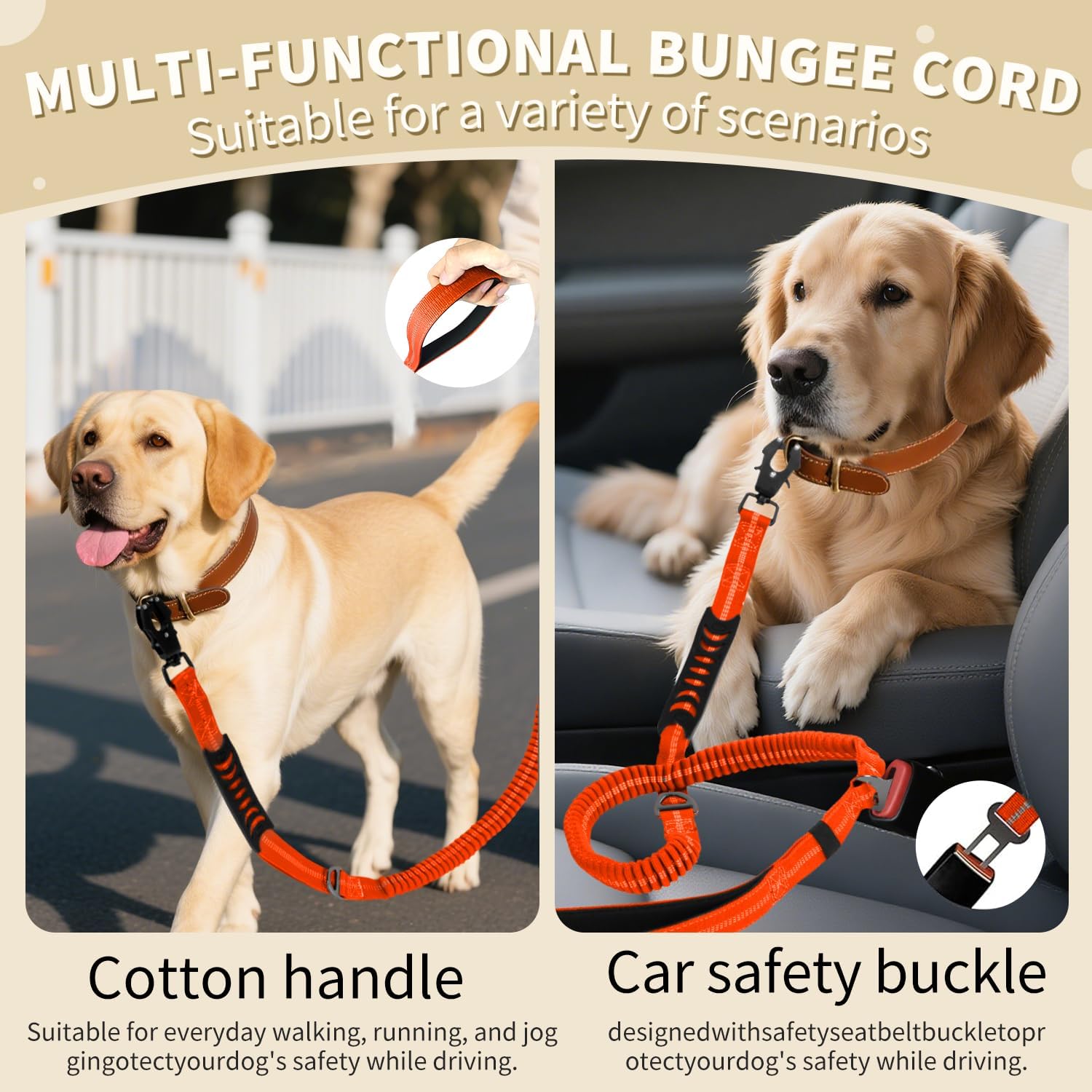 - 【🐕Multiple Safety】Three highly Reflective Threads have been added to the bungee leash to ensure the safety of you and your dog at night.1 D-ring near the training control handle to hang dog walking accessories. Designed with 1 seat belt buckle to keep your dog safety while you driving