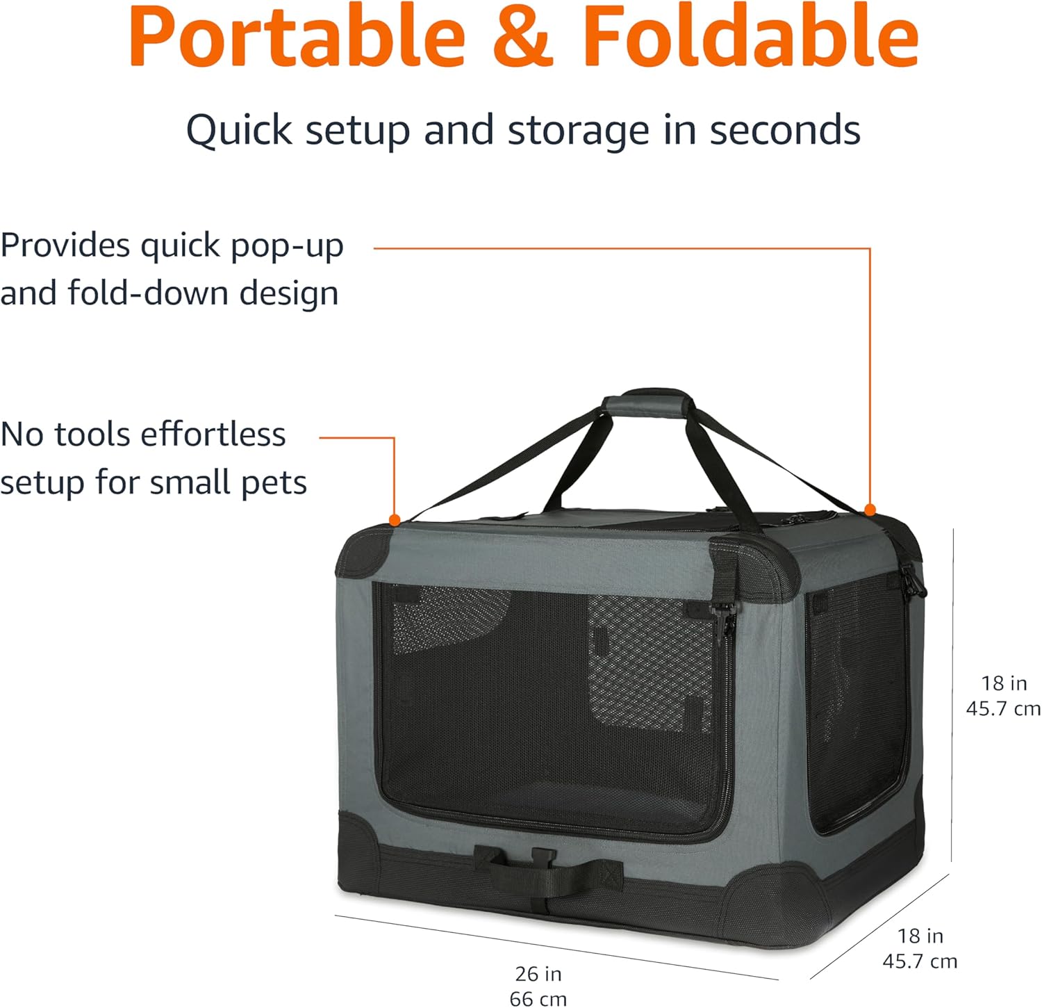 Amazon Basics 4-Doors Portable Soft-Sided Folding Travel Crate Kennel for cat, Dog, and Other Small Animals, Grey, S 26" x 18" x 18"
