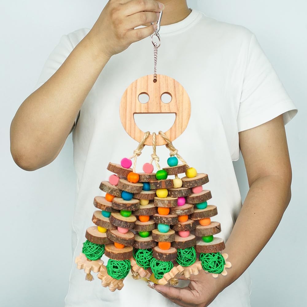 - SAFE & DURABLE MATERIAL: The bird toy for parrots is made of natural wood, hard and durable enough for parrots to sharpen their beaks and gnaw. The surface is dyed with edible coloring, safe and environmentally friendly, without glue or cables, and will not affect the health of the parrot.