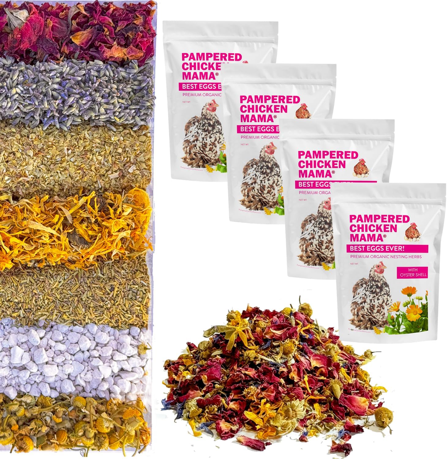 Pampered Chicken Mama Best Eggs Ever! Nesting Herbs for Chickens (4 Pounds) for Chicken Nesting Boxes Calcium Supplement for Chickens | Chicken Feed Supplies, Hen Treats for Coops (4 Bags)