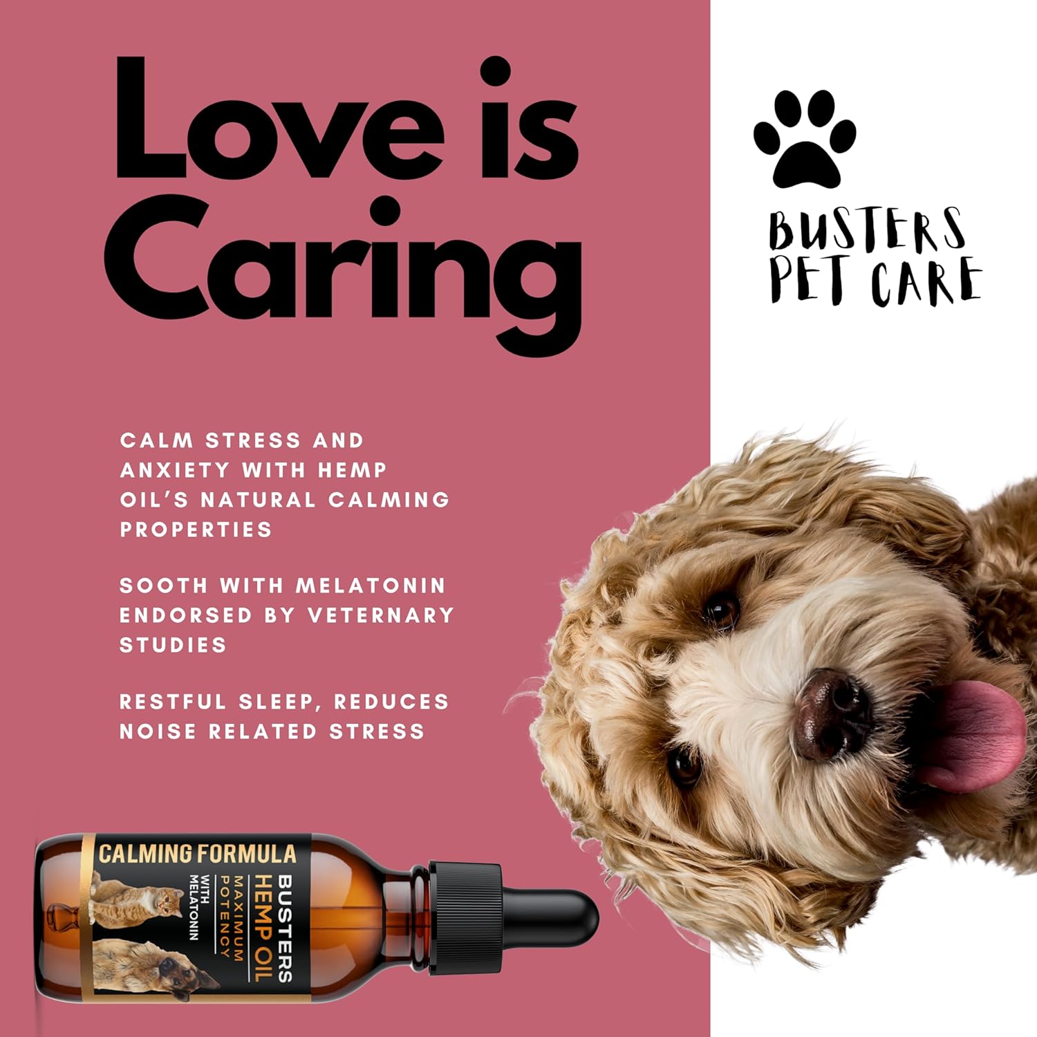 Busters 2Pack Calming Hemp Oil for Dogs, Cats, Infused with MELATONIN, Sleep Support, Soothing, Natural Relief, Ideal Omega Ratio, Adrenal Support (Calming Formula 2-Pack)