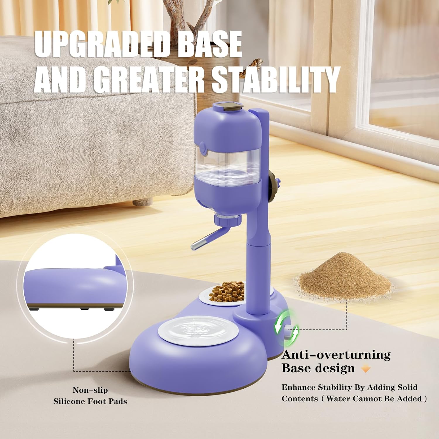 - 【Anti-overturning Base】In order to solve the pain point that the vertical water dispenser is easy to be overturned by pets,MITOCAPY conducted a series of experiments and finally designed this anti-overturning pet water dispenser.With these non-slip silicone foot pads on the bottom of the base,MITOCAPY dog water bottle dispenser has a greater stability than normal vertical water dispenser.Even you could also enhance much more stability by adding solid contents into the base,such as sand, pebbles and so on.