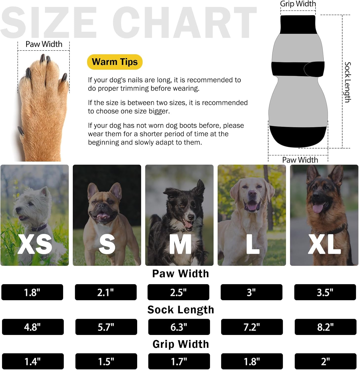 - SIZE GUIDE: M-Paw width 2.5in, stocking length 6.3in. If the paw width is between two sizes, please choose the larger size. Includes 6 dog grip socks (two more available for replacement than other sets).