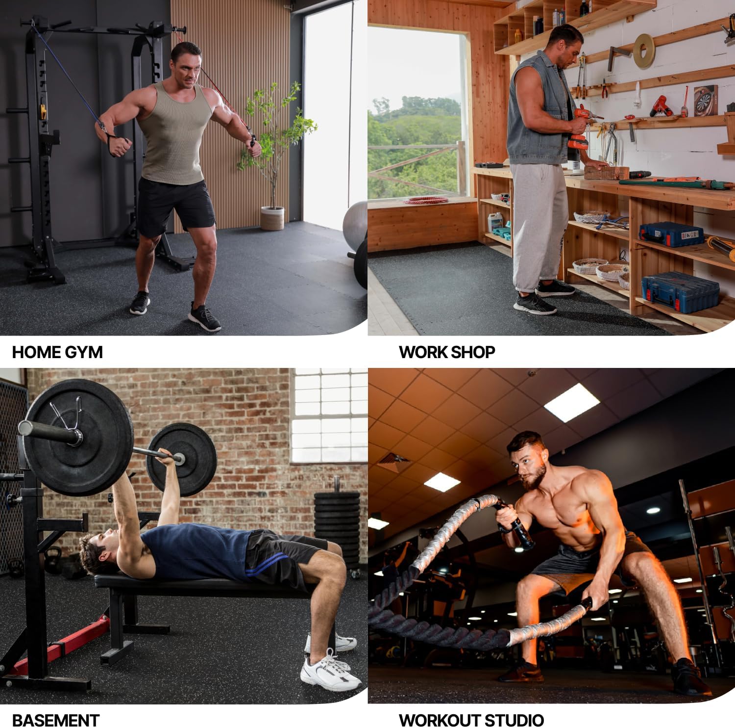 - [Sturdy Rubber Build]: Crafted from premium recycled rubber, our gym mats handle intense workouts with ease. These resilient tiles effortlessly support heavy machinery, providing reliable floor protection against scratches, scuffs, and dents from weights, dumbbells, medicine balls, jump ropes, and other workout gear in a home gym.