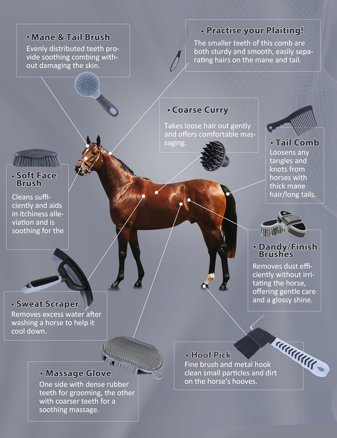 - Multi-Functional Set: This versatile horse grooming kit includes a variety of brushes designed for full-body cleaning, soothing massage, and coat grooming, providing a one-stop solution for all your horse care needs.
