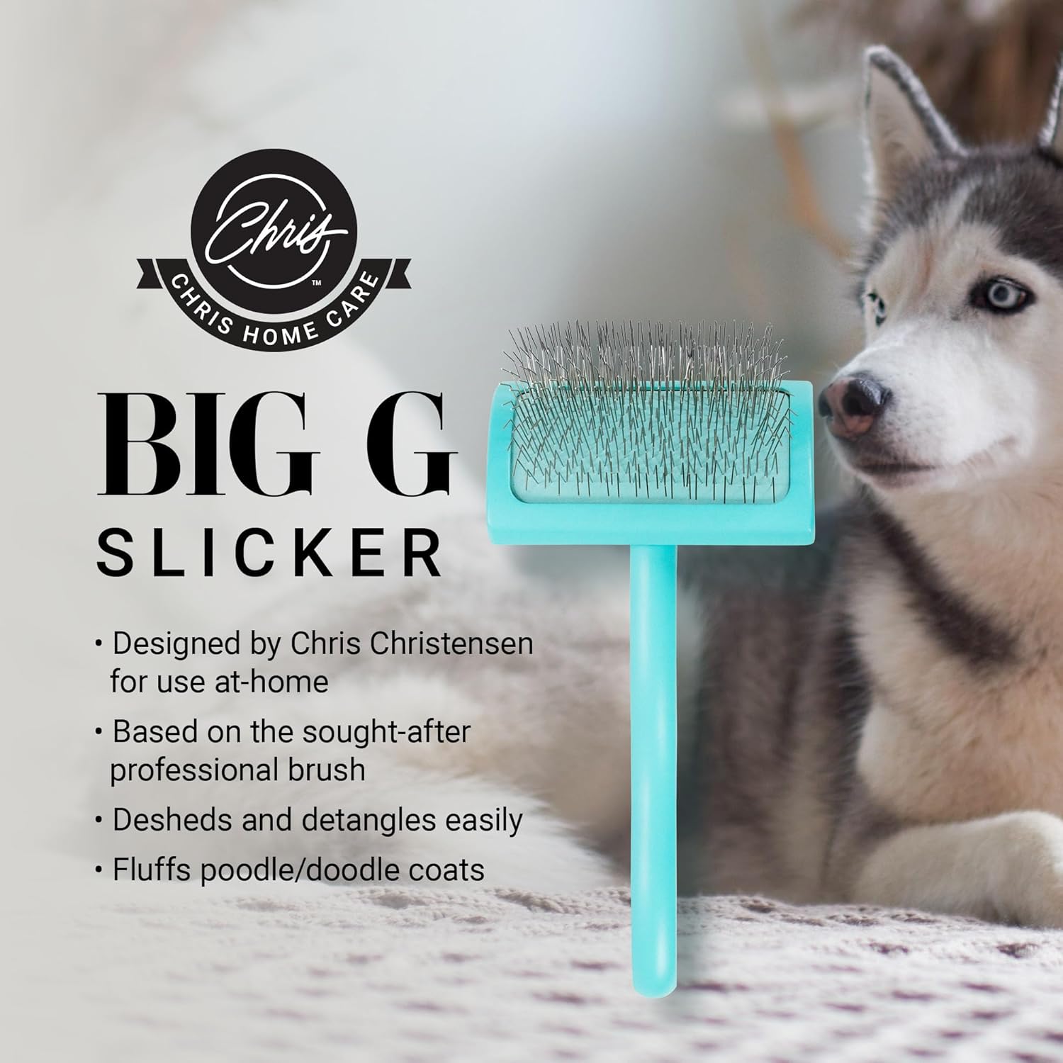 - ‘THE’ DOG BRUSH – based on the Original Big G Slicker Brush used by professional groomers. Pet owners can benefit from the Chris Christensen difference without the professional price tag. Use the Chris Home Care Big G for deshedding, detangling, finishing, and fluffing your dog between groomer visits. Available in a limited-edition teal color and two sizes to fit your breed and size of dog. For at-home use.